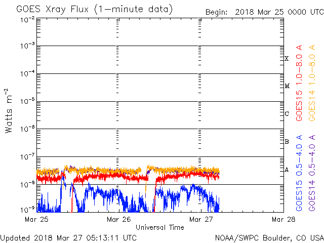 - 2018/ 3/23 14:39 コロナホールの影響が到来し、太陽風の速度は少し高まっています。