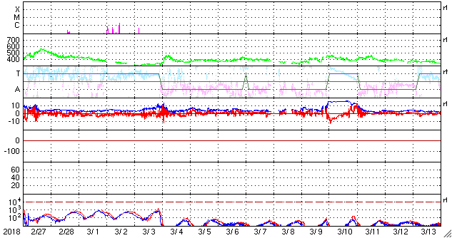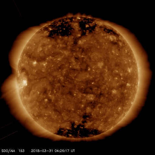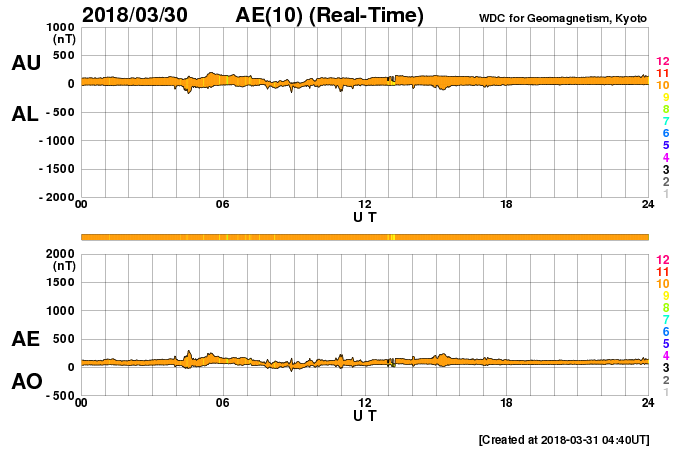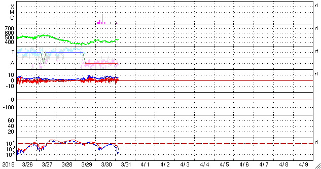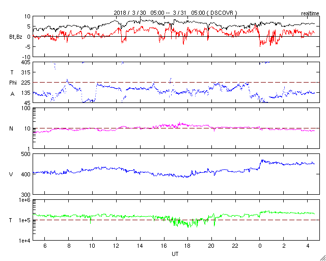 2018/ 3/31 13:41 更新 2703黒点群でC4.6の小規模フレアが発生しました。Cフレアは1か月ぶりです。 担当 篠原 太陽の東端に現れた黒点群は、 2703黒点群と番号が付けられています。 この領域で、昨夕、30日17時(世界時30日8時)に、 C4.6の小規模フレアが発生しました。 Cクラスのフレアの発生は、3月2日のC1.9以来、およそ1か月ぶり、 C4に達する規模のフレアは、2月10日のC4.6以来(偶然同じ値です)、 およそ2か月ぶりです。 GOES-14衛星のX線カメラによる動画を掲載します。 2703群では、その後もBクラスの小さい活動が起きています。 この後もCクラスの活動は起きるでしょうか。 太陽風は、昨日のニュースの後、速度は400km/秒に下がりましたが、 今朝くらいから少し高まって、 450km/秒とやや高速の状態に戻っています。 磁場強度は、6nT前後と平均的な状態です。 磁場の南北成分は、北寄りの傾向です。 磁気圏は穏やかで、AE指数は特に変化はありません。 SDO衛星AIA193の太陽コロナ写真は、 今日は正しい向きに戻っています。 中央部にコロナホールは見られず、 今後、太陽風は穏やかに推移しそうです。 放射線帯の高エネルギー電子は、減少が進んでいます。 赤線のGOES-15は、かろうじて10,000に達していますが、 明日には割っていそうです。 ![]() GOES-14衛星のX線カメラによる、C4.6の小規模フレア。 (c) NOAA/SWPC ![]() SDO衛星のAIA193カメラによる太陽コロナの様子 (c) SDO (NASA) ![]() SDO衛星による太陽の可視光写真。マウスの矢印を写真に重ねると、黒点番号付きの写真に切り替わります。 (c) SDO (NASA) ![]() GOES衛星の太陽X線データ (c) NOAA/SWPC ![]() DSCOVRが観測した太陽風の磁場(1番上の枠、黒線は全体の強度、赤線は南北成分) および、太陽風の密度(3番目の紫線)、速度(4番目の青線) (c) データ:NOAA/SWPC、作図:宇宙天気ニュース ![]() AE指数(速報値) 下段のAEグラフの値が高くなると、オーロラ活動が活発化しています。 (c) 京都大学WDC ![]() ![]() 27日の太陽周期に合わせたデータプロット 太陽が同じ面を地球に向けていた27日前の変化から、今後を予想することができます。 (c) 作図:宇宙天気ニュース