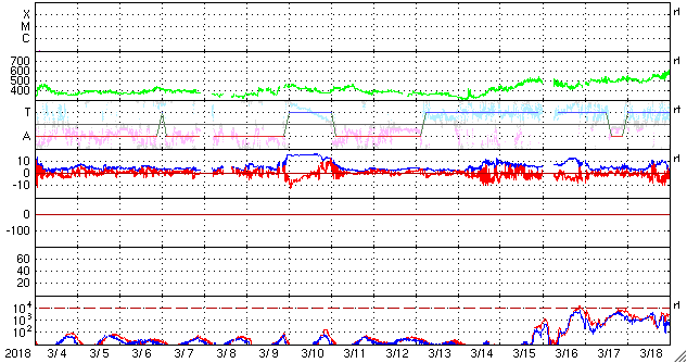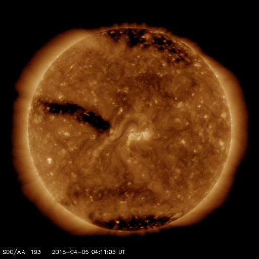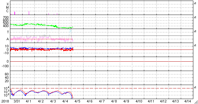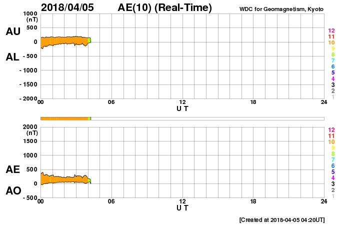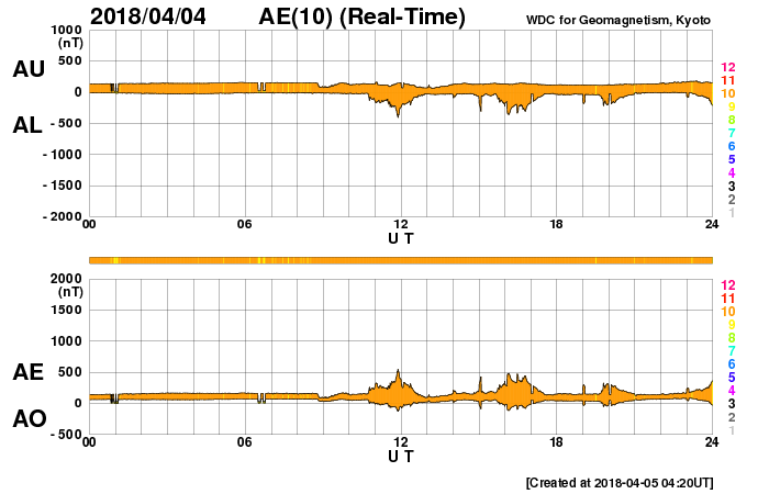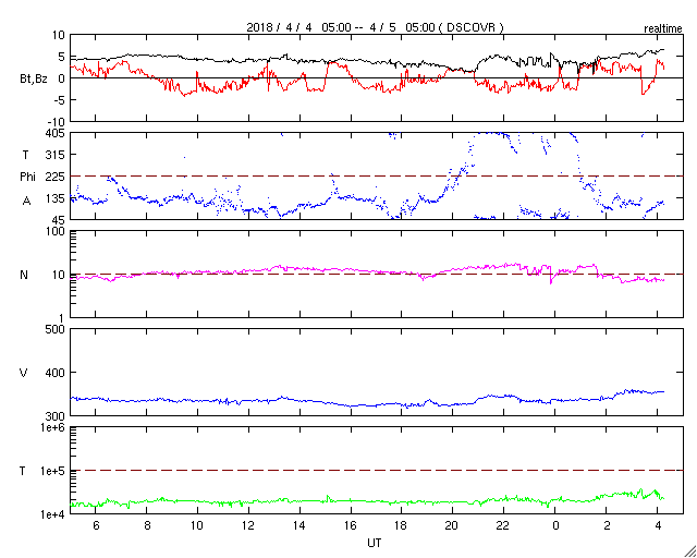 2018/ 4/ 5 13:29 更新 低速の太陽風が続いています。磁気圏では弱い活動が起きています。 担当 篠原 太陽風の速度は、 330km/秒から350km/秒に少し上がっていますが、 変化は小さく、低速の状態は続いています。 太陽風の磁場強度も、 4nTから6nTへ少し強まる変化が見えています。 太陽風磁場の南北成分は、昨日のニュース以降、 弱い南向きにも変化するように傾向が変わっています。 磁気圏では弱い活動が起きやすくなっていて、 AE指数は300〜500nTの変化が度々発生しています。 SDO衛星AIA193では、 東側(左側)の赤道域に、 コロナホールが横方向に伸びています。 まだ、先頭は中心線に達しておらず、 影響の始まりは、4〜5日後くらいでしょう。 それまでは、穏やかな太陽風が続きそうです。 太陽は今日も無黒点です。 X線グラフに変化はなく、太陽は穏やかです。 ![]() SDO衛星のAIA193カメラによる太陽コロナの様子 (c) SDO (NASA) ![]() SDO衛星による太陽の可視光写真 (c) SDO (NASA) ![]() DSCOVRが観測した太陽風の磁場(1番上の枠、黒線は全体の強度、赤線は南北成分) および、太陽風の密度(3番目の紫線)、速度(4番目の青線) (c) データ:NOAA/SWPC、作図:宇宙天気ニュース ![]() AE指数(速報値) 下段のAEグラフの値が高くなると、オーロラ活動が活発化しています。 (c) 京都大学WDC ![]() ![]() 27日の太陽周期に合わせたデータプロット 太陽が同じ面を地球に向けていた27日前の変化から、今後を予想することができます。 (c) 作図:宇宙天気ニュース