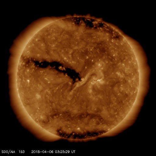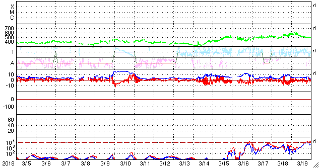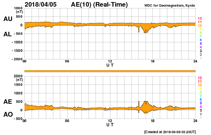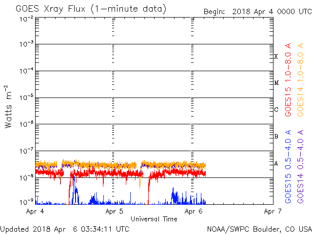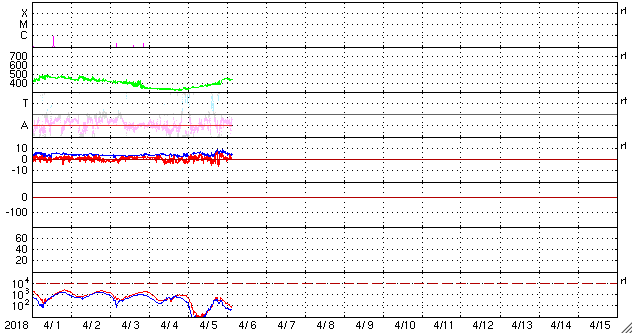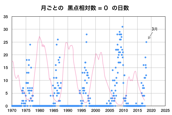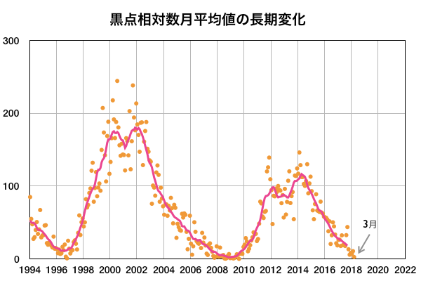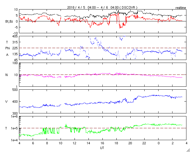 2018/ 4/ 6 12:31 更新 太陽風の速度が少し高まっています。3月の黒点相対数は 2.5 でした。 担当 篠原 WDC-SILSOより、 3月の黒点相対数の月平均値は、2.5 と発表されました。 昨年11月に、月平均値が5.7と、 今回の極小期で初めて1桁台に下がりましたが、 以降、8.2、6.7、10.6と1桁でも大きい方に留まっていました。 しかし、今回、一気に 0 近くまで大きく下がりました。 月平均値が1桁台の前半まで下がったのは、 第24活動周期の初めの頃の2009年8月以来、 およそ9年ぶりです。 この月は、1か月間無黒点が続き、平均値も 0.0 でした。 3枚目の図で、無黒点の日数が30日の線を越えて、 31日のところに達しているデータです。 3月の無黒点の日数は、25日でした。 これから、第23期と第24期の間の極小期と同様に、 無黒点日が25日を超える月が繰り返し発生するのでしょうか。 第25期が始まるまで、寂しい太陽面が続きそうです。 現在の太陽風は、 速度が上がって、450km/秒とやや高速になっています。 速度の変化に伴って、磁場強度も5nTから8nTに少し強まり、 現在は5nTに戻っています。 磁場の南北成分は、0nT付近か、北寄りの傾向になっています。 このため、磁気圏は全体としては穏やかで、 AE指数のグラフは、太陽風磁場が一時的に南を向いた頃に、 500nTの中規模の変化を起こしている程度です。 太陽風の高まりは、一時的な変化ではないでしょうか。 SDO衛星AIA193のコロナホールの影響が始まるまで、 基本的には穏やかな風が続きそうです。 太陽は無黒点が続いています。 X線のグラフも変化はありません。