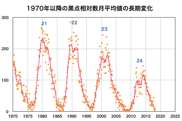 (c) 黒点データ:WDC-SILSO、作図:宇宙天気ニュース ![]() 1970年以降の太陽黒点相対数の長期変化。 (c) 黒点データ:WDC-SILSO、作図:宇宙天気ニュース ![]() 1970年以降の月毎の無黒点日の日数。 (c) 黒点データ:WDC-SILSO、作図:宇宙天気ニュース ![]() SDO衛星のAIA193カメラによる太陽コロナの様子 (c) SDO (NASA) ![]() SDO衛星による太陽の可視光写真 (c) SDO (NASA) ![]() DSCOVRが観測した太陽風の磁場(1番上の枠、黒線は全体の強度、赤線は南北成分) および、太陽風の密度(3番目の紫線)、速度(4番目の青線) (c) データ:NOAA/SWPC、作図:宇宙天気ニュース ![]() AE指数(速報値) 下段のAEグラフの値が高くなると、オーロラ活動が活発化しています。 (c) 京都大学WDC ![]() ![]() 27日の太陽周期に合わせたデータプロット 太陽が同じ面を地球に向けていた27日前の変化から、今後を予想することができます。 (c) 作図:宇宙天気ニュース