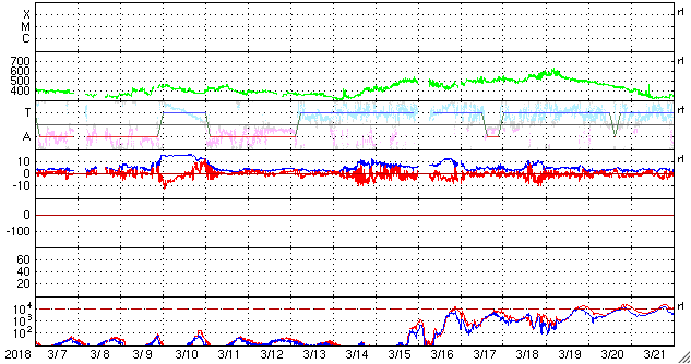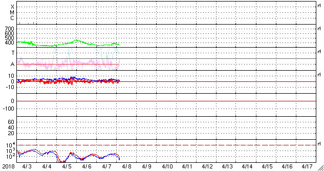磁場強度は、3〜4nTとやや弱い状態です。