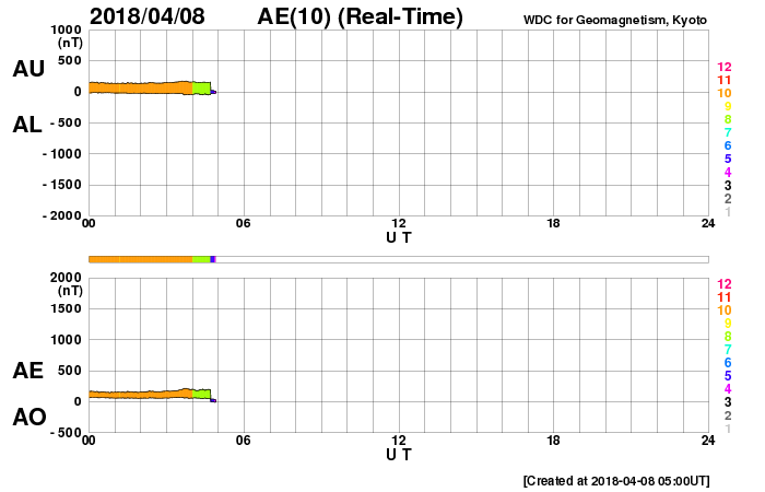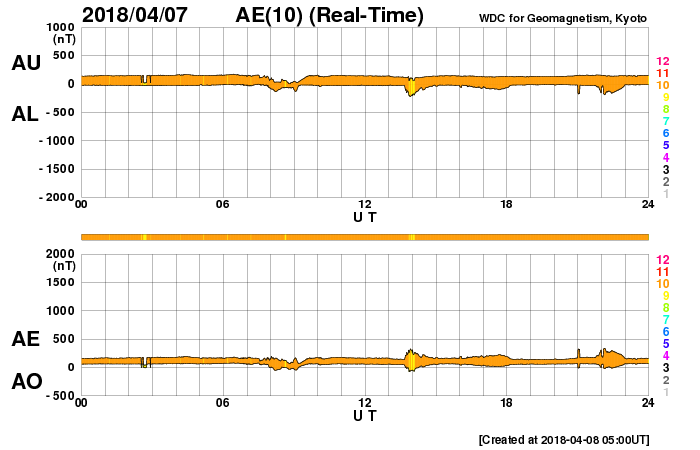 下段のAEグラフの値が高くなると、オーロラ活動が活発化しています。