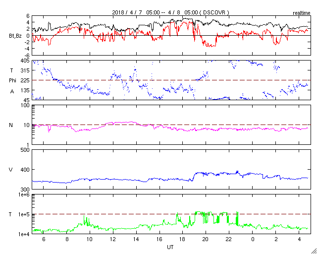 - 2018/ 4/ 5 13:29 低速の太陽風が続いています。磁気圏では弱い活動が起きています。