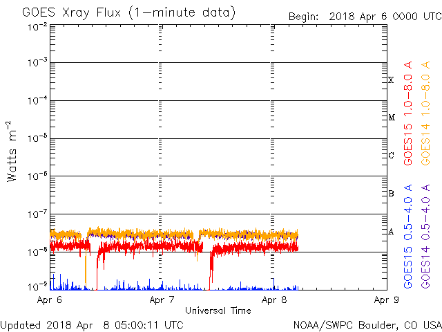 - 2018/ 4/ 6 12:31 太陽風の速度が少し高まっています。3月の黒点相対数は 2.5 でした。