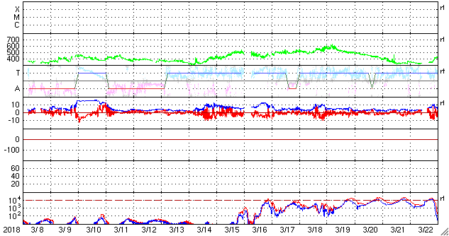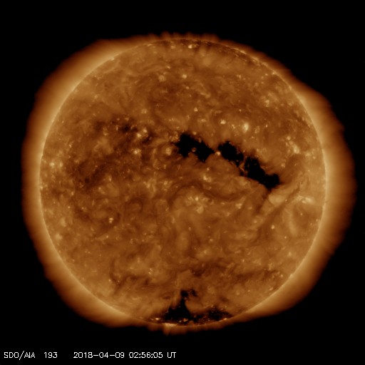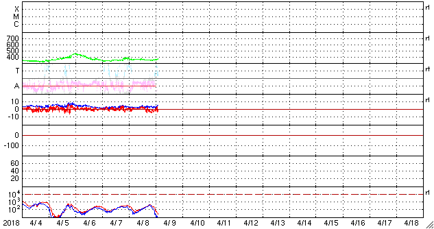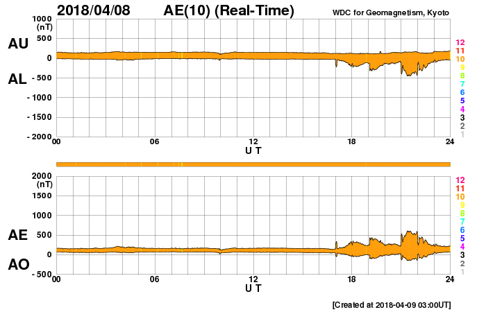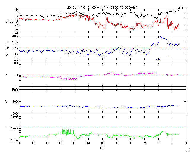 2018/ 4/ 9 12:04 更新 低速の太陽風が続いています。これからコロナホールの影響が始まりそうです。 担当 篠原 穏やかな太陽風が続いています。 速度は360km/秒と低速の状態で安定し、 磁場強度は、3nTから5nTへ上がっていますが、 変化は小さく、平均的な値に戻った程度です。 ただし、太陽風磁場の南北成分は、 グラフの途中から南向きに変化する様に傾向が変わっています。 このため、磁気圏の活動も途中からやや高まって、 AE指数で300〜500nTの小規模の変化が 発生する様になっています。 SDO衛星AIA193では、コロナホールは更に西に進み、 地球へ影響が及び始める目安の位置に近付いています。 この後、太陽風の磁場強度が高まる変化が見られると、 高速太陽風の到来になるでしょう。 磁場の南寄りの傾向が続けば、 オーロラの活動も高まりそうです。 太陽は、無黒点で、 穏やかな状態が続いています。 ![]() SDO衛星のAIA193カメラによる太陽コロナの様子 (c) SDO (NASA) ![]() SDO衛星による太陽の可視光写真 (c) SDO (NASA) ![]() DSCOVRが観測した太陽風の磁場(1番上の枠、黒線は全体の強度、赤線は南北成分) および、太陽風の密度(3番目の紫線)、速度(4番目の青線) (c) データ:NOAA/SWPC、作図:宇宙天気ニュース ![]() AE指数(速報値) 下段のAEグラフの値が高くなると、オーロラ活動が活発化しています。 (c) 京都大学WDC ![]() ![]() 27日の太陽周期に合わせたデータプロット 太陽が同じ面を地球に向けていた27日前の変化から、今後を予想することができます。 (c) 作図:宇宙天気ニュース