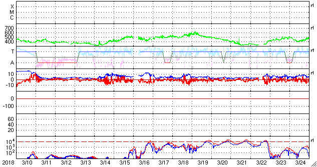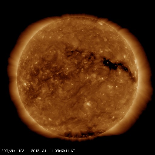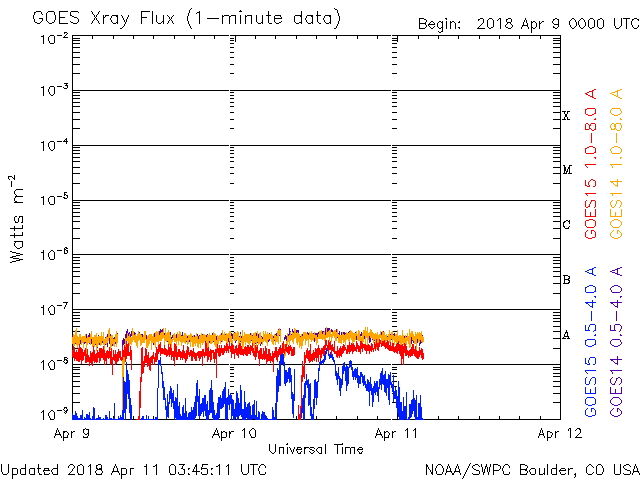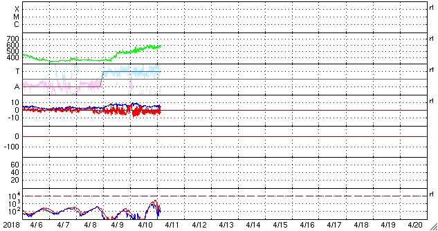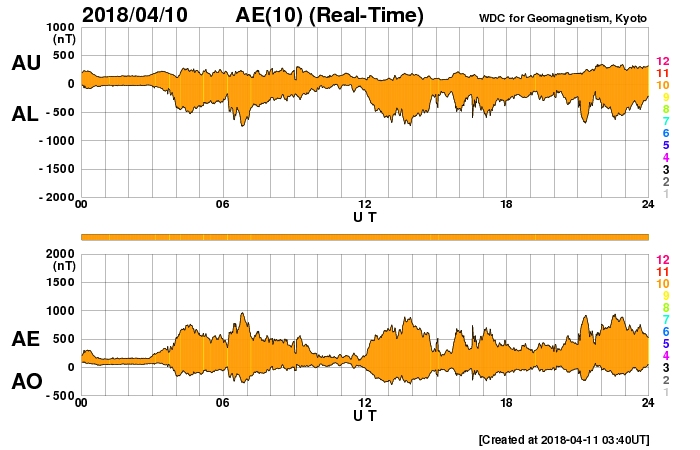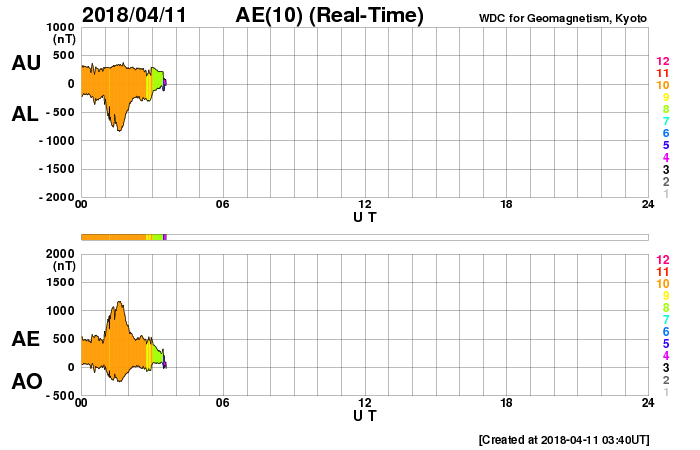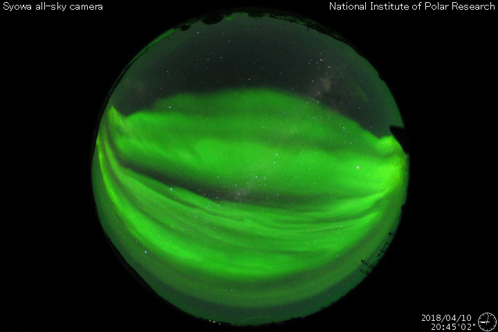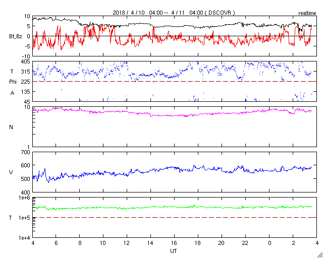 2018/ 4/11 12:46 更新 太陽風の速度は550km/秒に上がり、磁気圏の活動も活発です。 担当 篠原 太陽風の速度は、昨夜には550km/秒へ高まり、 以降、550〜570km/秒の高速の風が続いています。 磁場強度は、少し下がったものの、 5nTと平均的な強さを保っています。 太陽風磁場の南北成分は、 弱い南寄りの傾向が続いています。 速度が高まっていることと重なって、 磁気圏の活動は活発になり、 AE指数は、500〜1000nTと中規模の活動が連続しています。 昨日に続き、南極、昭和基地のオーロラを紹介します。 世界時10日21時頃の活動です。 太陽風の磁場強度は、まだ平均的な値を保っています。 磁場の南寄りの傾向が続けば、 磁気圏も活動的な状態が続きそうです。 太陽で昨日見えていた黒点は、夜には見えなくなり、 今朝のNOAAの報告書には掲載されていません。 X線グラフに変化はなく、太陽は穏やかです。