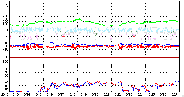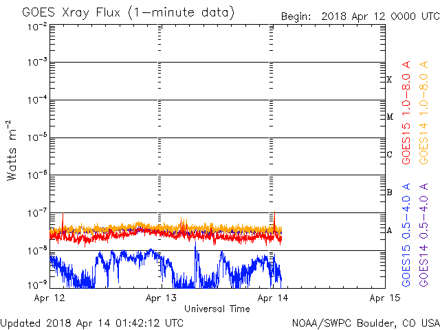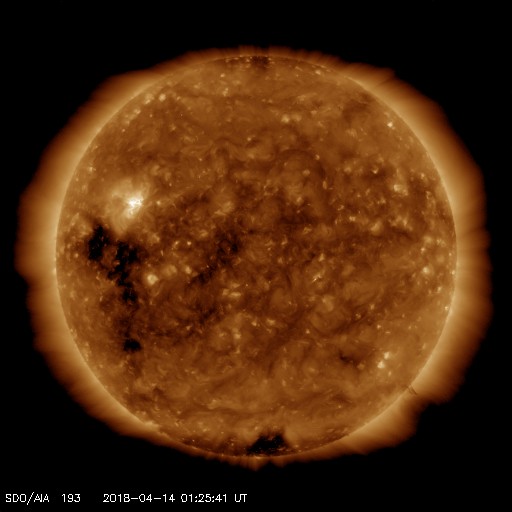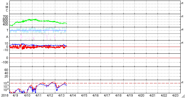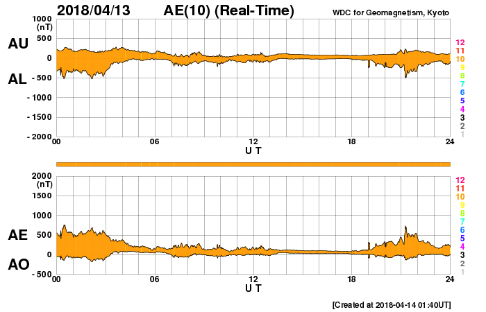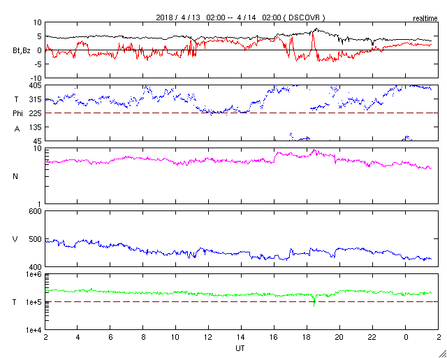 2018/ 4/14 10:43 更新 2704黒点群は消えかけています。太陽風はやや高速です。 担当 篠原 2704黒点群は、今日に入った頃から小さくなり始め、 掲載の写真ではほとんど見えないくらいになっています。 太陽はこのまま無黒点に戻りそうです。 太陽風は、速度が430〜450km/秒くらいで推移しています。 高速の状態は終わりかけています。 磁場強度は、5nTから4nTへ下がり気味です。 磁場の南北成分は、南寄りになったり、北寄りになったり、 ゆっくりと変化しています。 南向きに変化した頃に、磁気圏でも活動がやや高まり、 AE指数は200〜500nTの小規模の変化が 時間をおいて発生しています。 SDO衛星AIA193では、 太陽の西側(右側)のコロナホールは見えなくなり、 太陽風は穏やかになりそうです。 一方、東側(左側)の南側に次のコロナホールが姿を表しています。 次の太陽風の変化はこの領域の影響になりそうです。 ![]() SDO衛星のAIA193カメラによる太陽コロナの様子 (c) SDO (NASA) ![]() SDO衛星による太陽の可視光写真。マウスの矢印を写真に重ねると、黒点番号付きの写真に切り替わります。 (c) SDO (NASA) ![]() GOES衛星の太陽X線データ (c) NOAA/SWPC ![]() DSCOVRが観測した太陽風の磁場(1番上の枠、黒線は全体の強度、赤線は南北成分) および、太陽風の密度(3番目の紫線)、速度(4番目の青線) (c) データ:NOAA/SWPC、作図:宇宙天気ニュース ![]() AE指数(速報値) 下段のAEグラフの値が高くなると、オーロラ活動が活発化しています。 (c) 京都大学WDC ![]() ![]() 27日の太陽周期に合わせたデータプロット 太陽が同じ面を地球に向けていた27日前の変化から、今後を予想することができます。 (c) 作図:宇宙天気ニュース