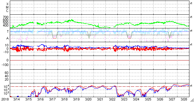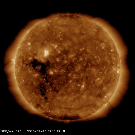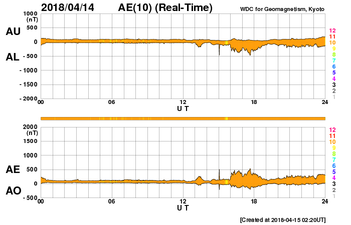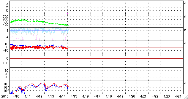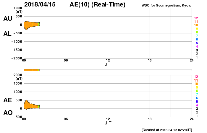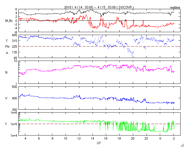 2018/ 4/15 11:20 更新 太陽風は低速になっています。太陽の東端から活動的な領域が近付いています。 担当 篠原 太陽風の速度は、今日に入る頃に400km/秒を割り、 現在は360km/秒まで下がっています。 太陽風は低速の風になっています。 磁場強度は、4nTで推移しています。 南北成分は、グラフの前半は0nT付近ですが、 後半から南寄りに振れて、-3〜-4nTの変化が続いています。 磁気圏の活動もやや高まって、 AE指数は、グラフの前半は静かですが、 後半から、300〜500nTの小規模の変化が見られる様になっています。 太陽風は、しばらく穏やかになりそうです。 SDO衛星AIA193の太陽コロナ写真では、 太陽の東側の赤道付近にコロナホールが見えています。 2日後くらいに太陽の中心線に達し、 更に3日後くらいから影響が始まると考えると、 4月20日頃でしょうか。 太陽は、無黒点です。 SDO衛星AIAカメラによると、 東端(左端)の向こう側でフレアが発生しています。 活動的な領域がある様で、 この後、黒点が姿を現すかもしれません。 ![]() SDO衛星のAIA193カメラによる太陽コロナの様子 (c) SDO (NASA) ![]() SDO衛星による太陽の可視光写真 (c) SDO (NASA) ![]() DSCOVRが観測した太陽風の磁場(1番上の枠、黒線は全体の強度、赤線は南北成分) および、太陽風の密度(3番目の紫線)、速度(4番目の青線) (c) データ:NOAA/SWPC、作図:宇宙天気ニュース ![]() AE指数(速報値) 下段のAEグラフの値が高くなると、オーロラ活動が活発化しています。 (c) 京都大学WDC ![]() ![]() 27日の太陽周期に合わせたデータプロット 太陽が同じ面を地球に向けていた27日前の変化から、今後を予想することができます。 (c) 作図:宇宙天気ニュース