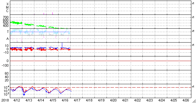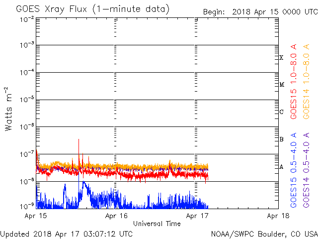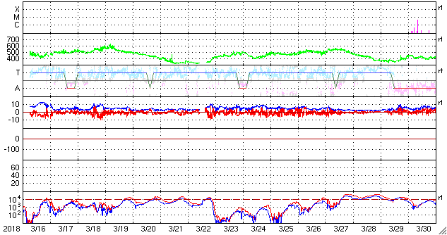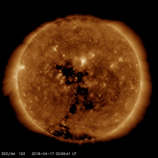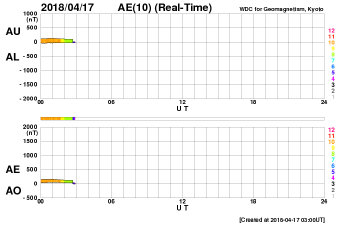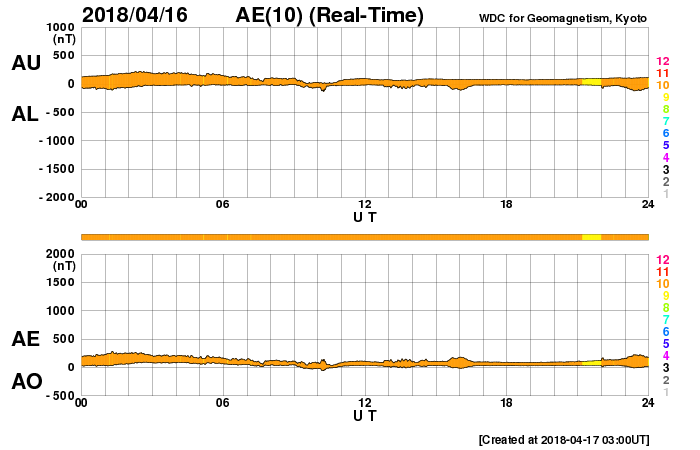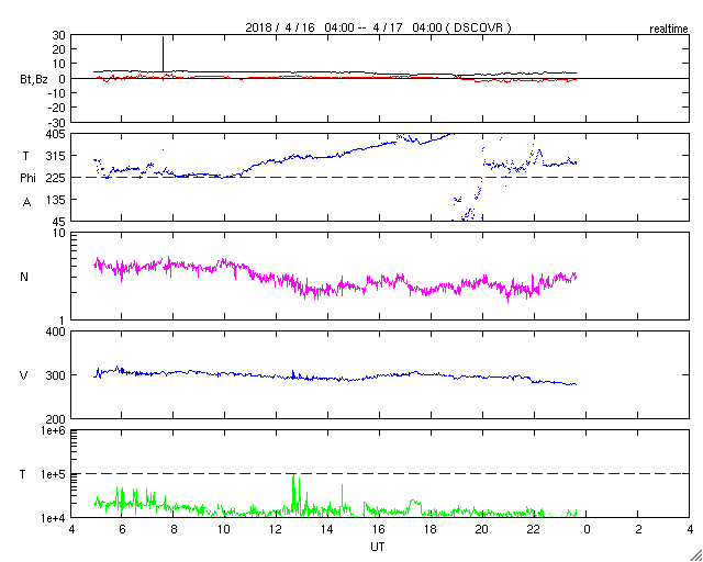 2018/ 4/17 12:08 更新 太陽に新しい黒点が現れています。太陽風はかなり低速になっています。 担当 篠原 昨日、新しく現れた小さい黒点には、 2705黒点群と番号が付けられた様です。 しかし、すぐに見えなくなっていて、現在はありません。 また、東端から現れた領域も、 白斑は見えていますが、黒点はない様です。 一方、北半球の西寄り(右側)に、 別の黒点が新しく発生しています。 こちらも小さい点が一つ見えるだけです。 X線グラフに変化はなく、太陽は穏やかです。 太陽風は、更に速度が下がり、 280km/秒とかなり低速になっています。 磁場強度は、エラーデータのためグラフが見にくくなっていますが、 3nTとやや弱い状態で安定しています。 磁気圏の活動は穏やかで、 AE指数に目立った変化は見られません。 SDO衛星AIA193では、 太陽の中心部にコロナホールが広がっています。 3日後くらいに、太陽風速度の高まりが到来している可能性があります。 27日前よりも赤道域の広がりが大きくなっているので、 地球への影響もより強まるかもしれません。