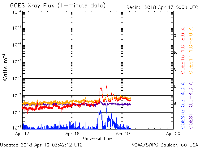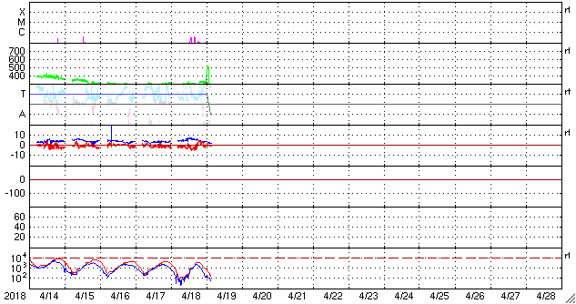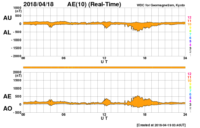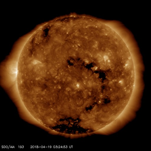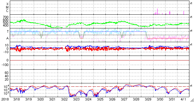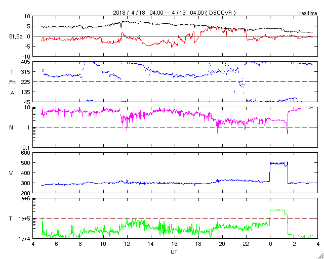 2018/ 4/19 12:41 更新 太陽の東端から黒点が現れています。太陽風は低速ですが、今後高まるかもしれません。 担当 篠原 太陽の東端から活動的な領域が姿を現しました。 X線グラフでは、 B3、B4という小さいフレアが観測されています。 可視光写真を拡大すると、黒点もある様です。 明日には番号も付いているのではないでしょうか。 今後の活動に注目して下さい。 また、太陽の中心部に小さい黒点が見えています。 昨夜くらいに一番良く見えていた様で、 この後は消えてしまうかもしれません。 太陽風は、300km/秒と低速の風が続いています。 (グラフの途中の高まりは、エラーデータです) 磁場強度は、5nTから2nTに下がっています。 太陽風磁場の大まかな方向の切り替わりが 到来しているのかもしれません。 磁気圏は概ね静穏ですが、 太陽風磁場の南向きの変化により、 AE指数に500nT程度の変化も発生しています。 SDO衛星AIA193では、コロナホールが太陽の西に進んでいます。 今後、この領域の影響で太陽風の高まりが やって来る可能性があります。 ![]() SDO衛星のAIA193カメラによる太陽コロナの様子 (c) SDO (NASA) ![]() SDO衛星による太陽の可視光写真。マウスの矢印を写真に重ねると、黒点番号付きの写真に切り替わります。 (c) SDO (NASA) ![]() GOES衛星の太陽X線データ (c) NOAA/SWPC ![]() DSCOVRが観測した太陽風の磁場(1番上の枠、黒線は全体の強度、赤線は南北成分) および、太陽風の密度(3番目の紫線)、速度(4番目の青線) (c) データ:NOAA/SWPC、作図:宇宙天気ニュース ![]() AE指数(速報値) 下段のAEグラフの値が高くなると、オーロラ活動が活発化しています。 (c) 京都大学WDC ![]() ![]() 27日の太陽周期に合わせたデータプロット 太陽が同じ面を地球に向けていた27日前の変化から、今後を予想することができます。 (c) 作図:宇宙天気ニュース