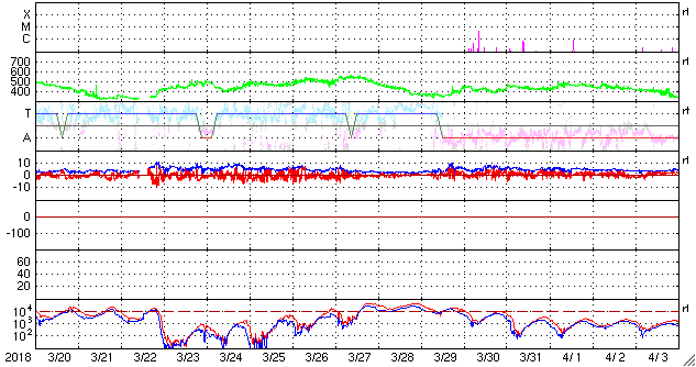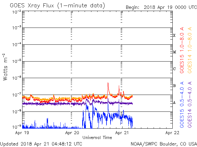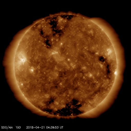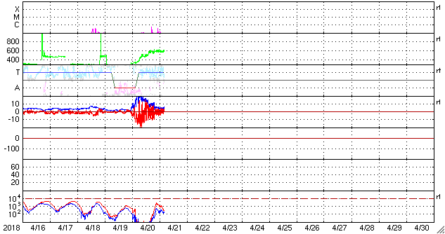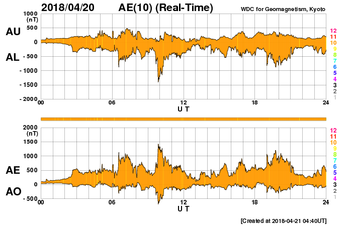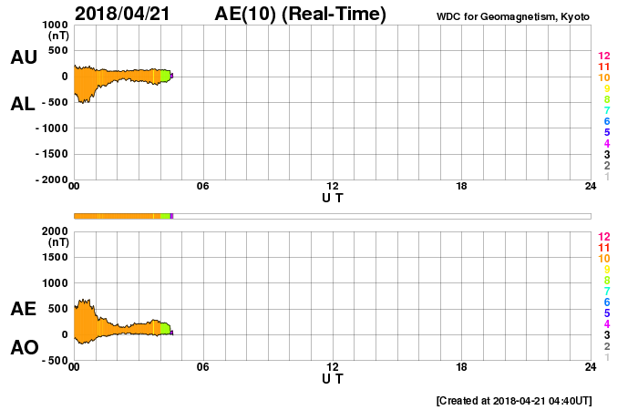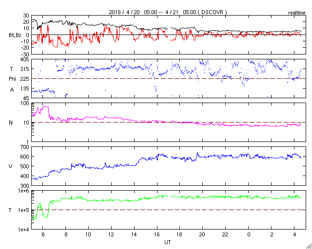 2018/ 4/21 13:48 更新 太陽風の速度は600km/秒に高まり、磁気圏の活動も活発になっています。 担当 篠原 太陽風の速度は、昨日のニュースの後に更に高まり、 夕方には500km/秒と高速の状態になり、 今日に入る頃、600km/秒へ達しました。 現在も、この高速の状態が続いています。 コロナホールの影響は、一段と強まっています。 太陽風の磁場強度は、速度の上昇とともに次第に下がり、 現在は4nTと平均的な値に戻っています。 速度の変化は既にピークを迎えている様です。 磁場の南北成分は、南北に頻繁に変化しています。 速度の高まりもあって、磁気圏の活動は一段と強まり、 AE指数は1000nTに達する大きな変化を数回記録しています。 このうち、世界時20日19時半頃のオーロラの様子を、 南極、昭和基地の全天カメラの動画で紹介します。 AE指数が1200nTまで大きく変化した頃です。 現在は磁場強度が下がってきたので、 磁気圏の活動は小さくなりそうです。 また、SDO衛星AIA193を見ると、 コロナホールは太陽の西の端に近付いています。 太陽風への影響は次第に弱まっていきそうです。 太陽では、2706黒点群の全体の姿が見える様になり、 昨日よりも少し発達している様です。 X線グラフを見ると、Bクラスの小さいフレアが数回発生しています。 今後、Cに達する活動を起こすでしょうか。 また、2706群の右下に小さい黒点が現れています。