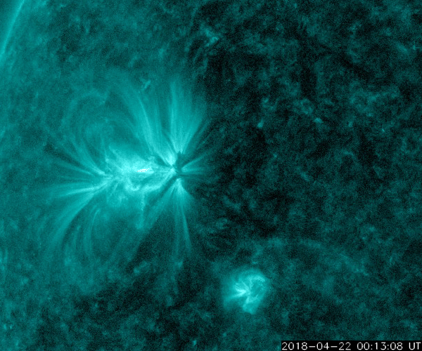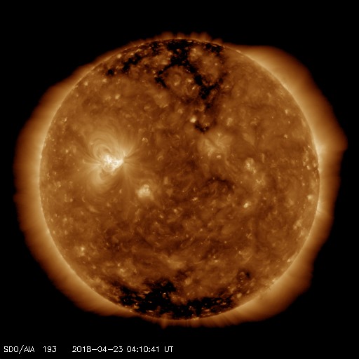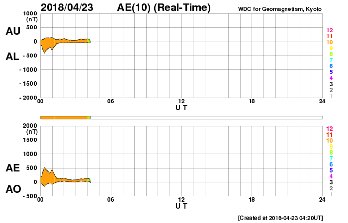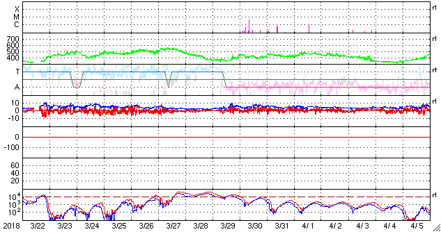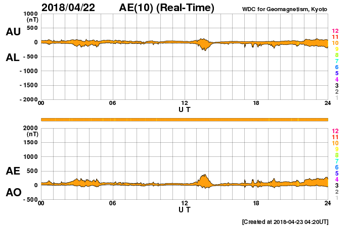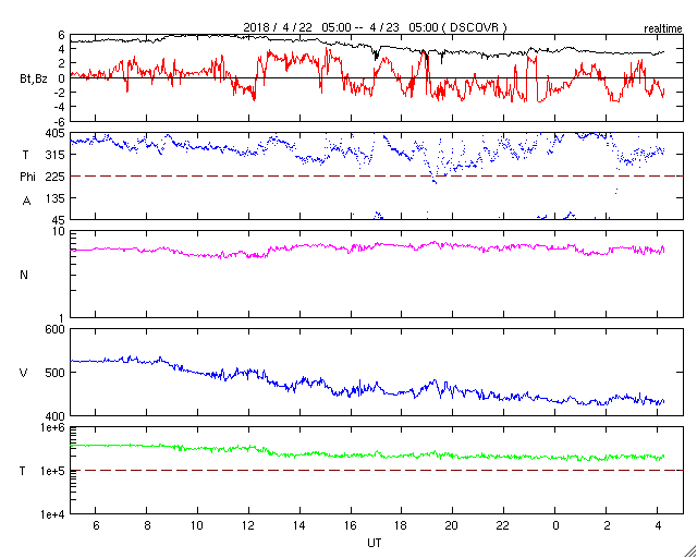 2018/ 4/23 13:27 更新 太陽風は平均的な速度に戻っています。 担当 篠原 太陽風の速度は、昨日の夜には500km/秒台を割り、 以降もゆっくりと低下して、 現在は430km/秒と平均的な速さに戻っています。 今回の高速太陽風は、2日半程で終わっています。 太陽風の磁場強度も、5nTから3nTへ下がり、 やや弱くなっています。 磁気圏の活動は、 昨日までと比べると穏やかになっていますが、 磁場の南北成分が南向きに小さく変化しているため、 AE指数で300〜500nTの弱い活動は続いています。 太陽では、2706黒点群が昨日と同程度の大きさで見えています。 X線グラフでは特に変化はなく、活動は穏やかです。 一方、SDO衛星AIA193の画像では、 黒点から磁力線に沿って広がるコロナの姿が見事です。 この1日間の様子を動画で紹介します。