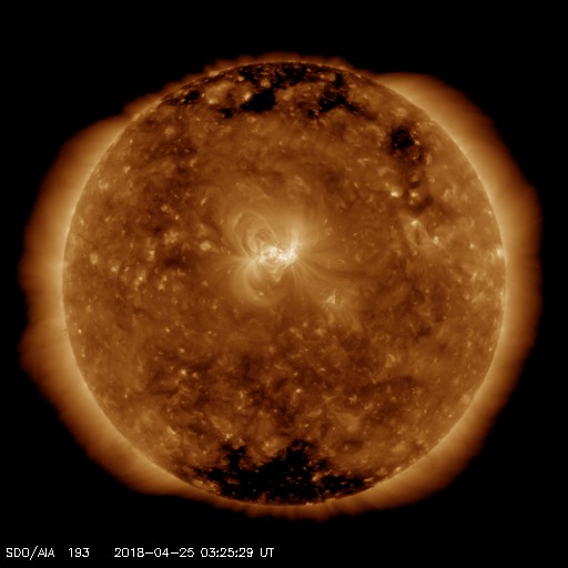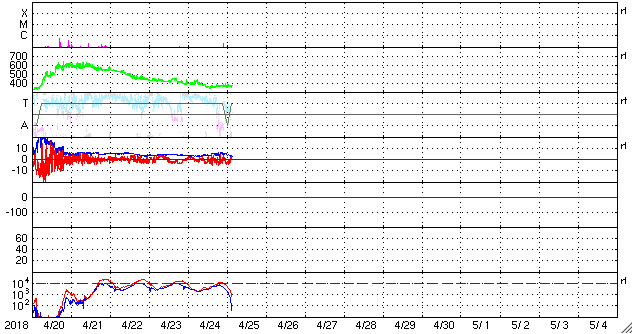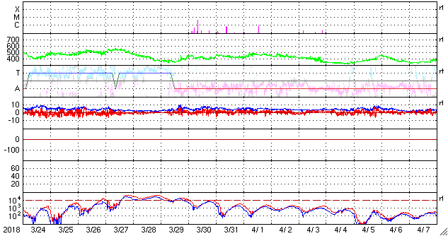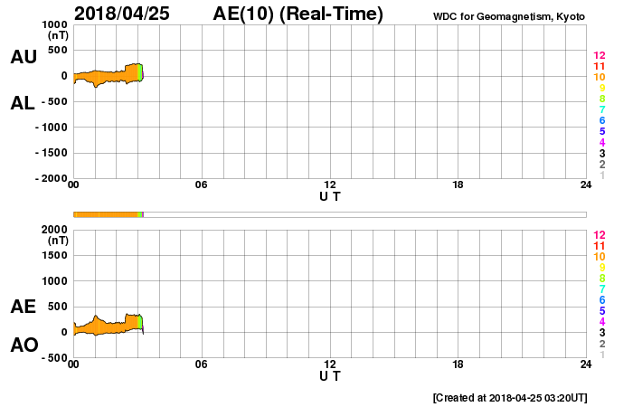 2018/ 4/25 12:37 更新 太陽風はやや低速になり、磁気圏も概ね静穏です。 担当 篠原 太陽風の速度は、370km/秒とやや低速になっています。 磁場強度は、3〜5nTと平均的かやや弱いくらいです。 太陽風は穏やかです。 太陽風磁場の南北成分は、 振れ幅は小さいですが、南寄りの変化になっています。 磁気圏は全体としては穏やかですが、 AE指数には、小さい変化が時々起きています。 SDO衛星AIA193では、 太陽の中心部にコロナホールは見られず、 穏やかな太陽風が続きそうです。 太陽では、2706黒点群がちょうど中心に達しています。 黒点の見え方に特に変化はなく、太陽は穏やかです。 ![]() SDO衛星のAIA193カメラによる太陽コロナの様子 (c) SDO (NASA) ![]() SDO衛星による太陽の可視光写真。マウスの矢印を写真に重ねると、黒点番号付きの写真に切り替わります。 (c) SDO (NASA) ![]() DSCOVRが観測した太陽風の磁場(1番上の枠、黒線は全体の強度、赤線は南北成分) および、太陽風の密度(3番目の紫線)、速度(4番目の青線) (c) データ:NOAA/SWPC、作図:宇宙天気ニュース ![]() AE指数(速報値) 下段のAEグラフの値が高くなると、オーロラ活動が活発化しています。 (c) 京都大学WDC ![]() ![]() 27日の太陽周期に合わせたデータプロット 太陽が同じ面を地球に向けていた27日前の変化から、今後を予想することができます。 (c) 作図:宇宙天気ニュース