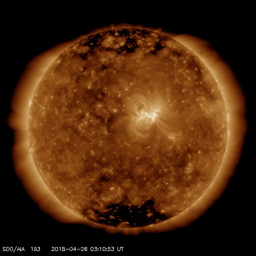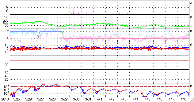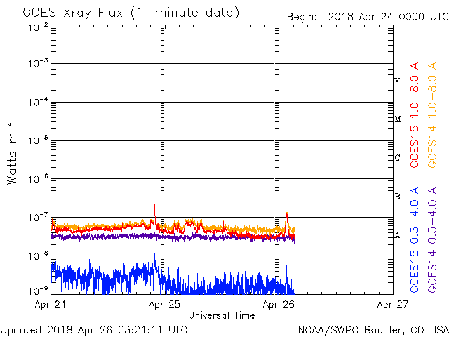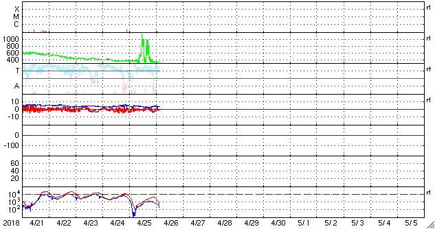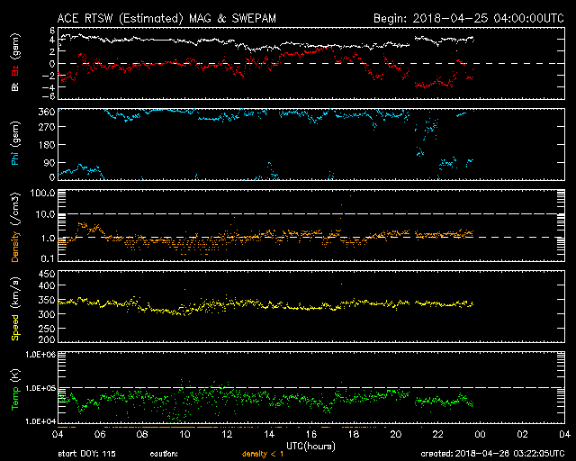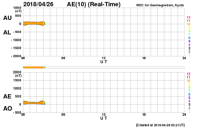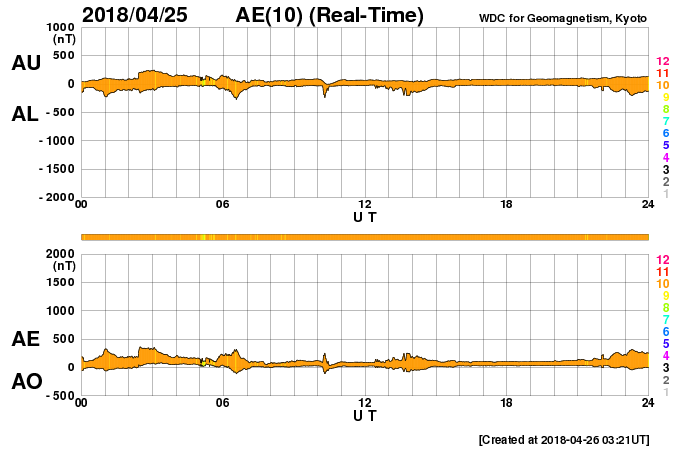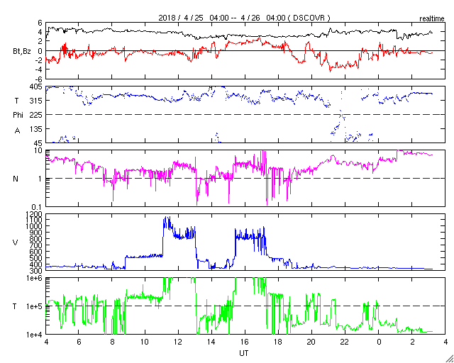 2018/ 4/26 12:22 更新 太陽風は低速で、磁気圏も穏やかです。 担当 篠原 太陽風の速度は、330km/秒へ下がり、 更に低速の風になっています。 今日は、DSCOVR衛星のデータが乱れているので、 ACE衛星のグラフも掲載しています。 磁場強度は、3〜4nTとやや弱い状態です。 穏やかな太陽風が続き、磁気圏も静穏です。 AE指数は、時々小さい変化が発生している程度で、 全体としては穏やかです。 SDO衛星AIA193の太陽コロナを見ると、 赤道から南北の低緯度域にかけて、 コロナホールは特に見られません。 穏やかな太陽風がしばらく続きそうです。 太陽の2706黒点群は、少しずつ小さくなっている印象です。 X線グラフも穏やかです。