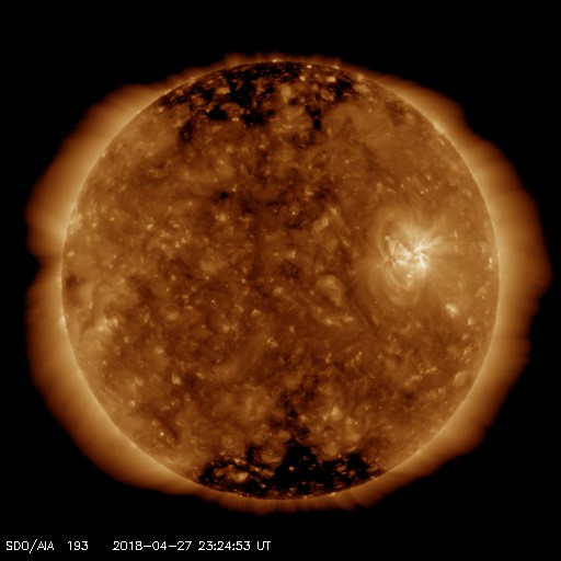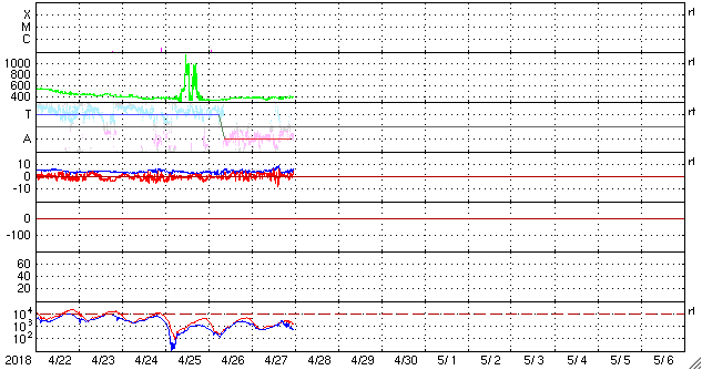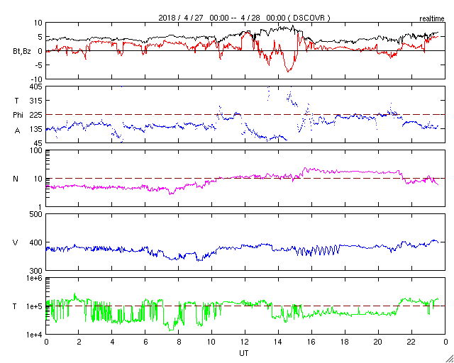 2018/ 4/28 08:44 更新 太陽風は380km/秒付近で安定し、磁気圏も穏やかです。太陽は無黒点になっています。 担当 篠原 太陽風は、昨日から今日にかけて、 速度380km/秒、磁場強度5nTの状態で安定しています。 グラフの最後で、速度が400km/秒に上がる変化をしていますが、 一時的なものか、このまま400km/秒付近で安定するのか、 しばらく様子を見て下さい。 どちらにしても、基本的には穏やかな太陽風が続いています。 太陽風磁場の南北成分は、北寄りの傾向になっています。 グラフの中程で、一時的に -7nTの南向きの変化が発生し、 AE指数に500nTの中規模の変化を起こしていますが、 その他の時間帯はAE指数に変化はなく、 磁気圏も穏やかです。 SDO衛星AIA193の太陽コロナ写真には、 極域以外にコロナホールはなく、 穏やかな太陽風はこのまましばらく続きそうです。 2706黒点群は、今日に入った頃に見えなくなり、 太陽は無黒点になっています。 STEREO Ahead衛星を参照すると、 太陽の東端の向こう側にも活動的な領域はなく、 無黒点がしばらく続くかもしれません。