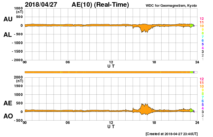 (c) SDO (NASA) ![]() SDO衛星による太陽の可視光写真 (c) SDO (NASA) ![]() DSCOVRが観測した太陽風の磁場(1番上の枠、黒線は全体の強度、赤線は南北成分) および、太陽風の密度(3番目の紫線)、速度(4番目の青線) (c) データ:NOAA/SWPC、作図:宇宙天気ニュース ![]() AE指数(速報値) 下段のAEグラフの値が高くなると、オーロラ活動が活発化しています。 (c) 京都大学WDC ![]() 27日の太陽周期に合わせたデータプロット 太陽が同じ面を地球に向けていた27日前の変化から、今後を予想することができます。 (c) 作図:宇宙天気ニュース