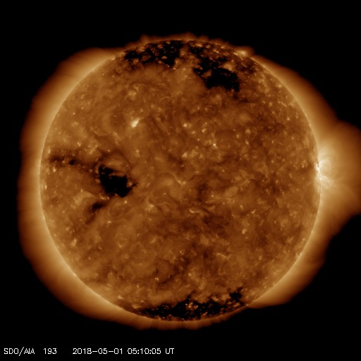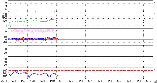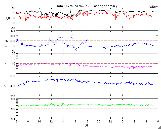 - 2018/ 4/30 10:19 太陽風は低速風になり、磁気圏も穏やかです。太陽は無黒点に戻っています。