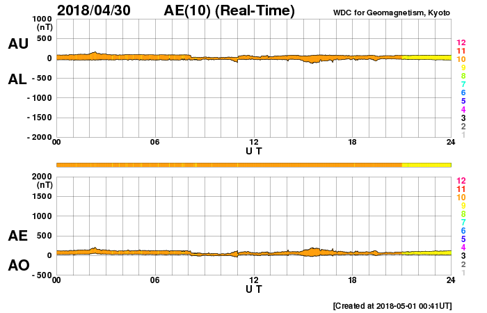 下段のAEグラフの値が高くなると、オーロラ活動が活発化しています。