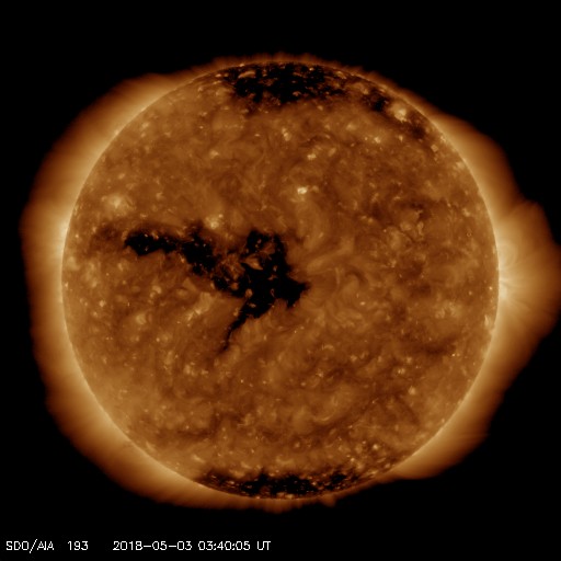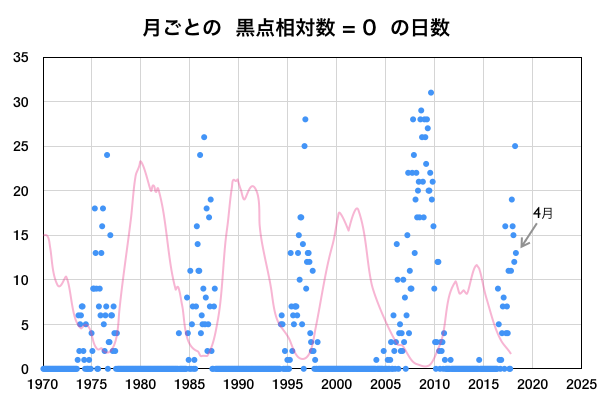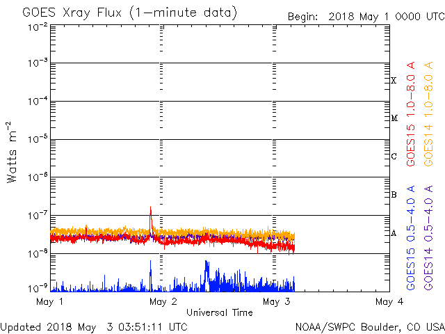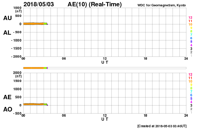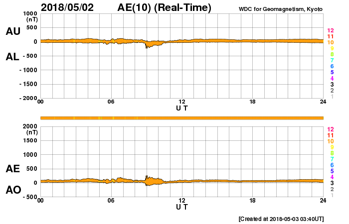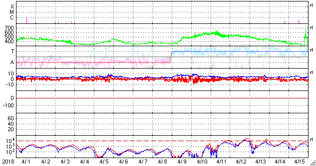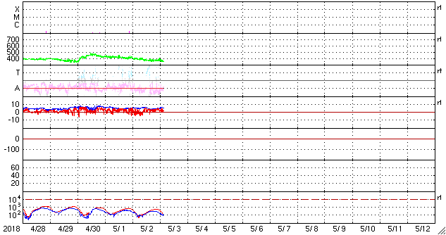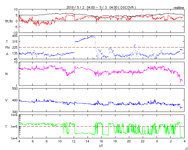 2018/ 5/ 3 12:51 更新 太陽風は低速になっています。4月の黒点相対数は 8.9 でした。 担当 篠原 WDC-SILSOより、黒点相対数の新しいデータが発表され、 4月の月平均値は、8.9 でした。 3月の 2.5 よりは高くなっていますが、 昨年の11月以降は、 10 を割るくらいの低い状態が続いています。 無黒点日の日数は13日と、 3月の25日から大きく下がりました。 4月中旬に2704黒点群が発生し、 後半には2706黒点群がやや大きくなっていたためです。 しかし、4月28日以降は再び無黒点の状態が続いています。 5月はどのような推移になるでしょうか。 現在の太陽風は、速度が360km/秒に下がり、 低速の風になっています。 磁場強度は、5nTと平均的な状態です。 磁場の南北成分は、北寄りの傾向が続いています。 磁気圏も穏やかで、 AE指数のグラフはほとんど変化が見られません。 SDO衛星AIA193では、 コロナホールの先頭(右端)が、太陽の中心に達しています。 3日後くらいから、太陽風の高まりが始まりそうです。 太陽は今日も無黒点です。 X線グラフも変化はなく、太陽はとても穏やかです。