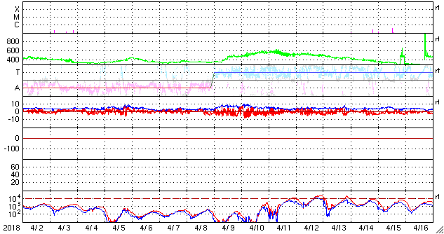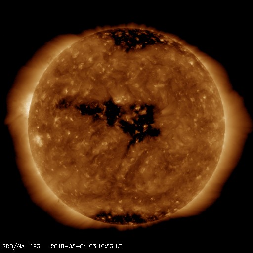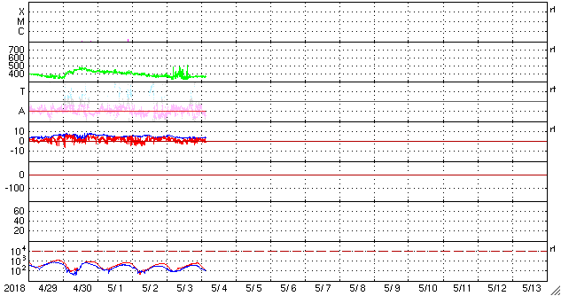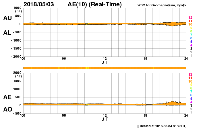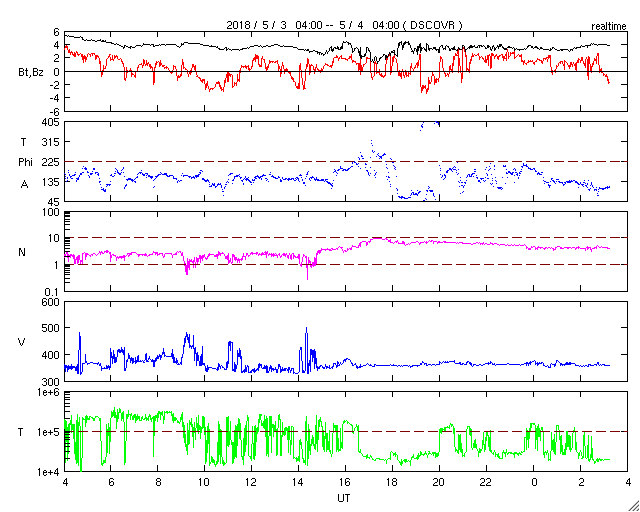 2018/ 5/ 4 12:30 更新 太陽風は低速で、磁気圏も穏やかです。 担当 篠原 太陽風は、350km/秒と低速の状態が続いています。 磁場強度も、3〜4nTとやや弱くなっています。 磁場の南北成分は、北寄りの傾向が続いています。 時々南向きに振れる変化もありますが、 太陽風の速度が遅くなっていることもあり、 磁気圏は穏やかで、AE指数はほとんど変化がありません。 SDO衛星AIA193の太陽写真では、 コロナホールが太陽の中心部に大きく広がっています。 地球の方向に速度の高い太陽風が吹き出しているところです。 明後日、6日頃に変化が始まりそうです。 太陽は無黒点で、穏やかです。 東端(左端)から活動的な領域が近付いている様です。 SDO衛星AIA193の写真で、明るくなっている部分です。 黒点が現れるでしょうか。 ![]() SDO衛星のAIA193カメラによる太陽コロナの様子 (c) SDO (NASA) ![]() SDO衛星による太陽の可視光写真 (c) SDO (NASA) ![]() DSCOVRが観測した太陽風の磁場(1番上の枠、黒線は全体の強度、赤線は南北成分) および、太陽風の密度(3番目の紫線)、速度(4番目の青線) (c) データ:NOAA/SWPC、作図:宇宙天気ニュース ![]() AE指数(速報値) 下段のAEグラフの値が高くなると、オーロラ活動が活発化しています。 (c) 京都大学WDC ![]() ![]() 27日の太陽周期に合わせたデータプロット 太陽が同じ面を地球に向けていた27日前の変化から、今後を予想することができます。 (c) 作図:宇宙天気ニュース