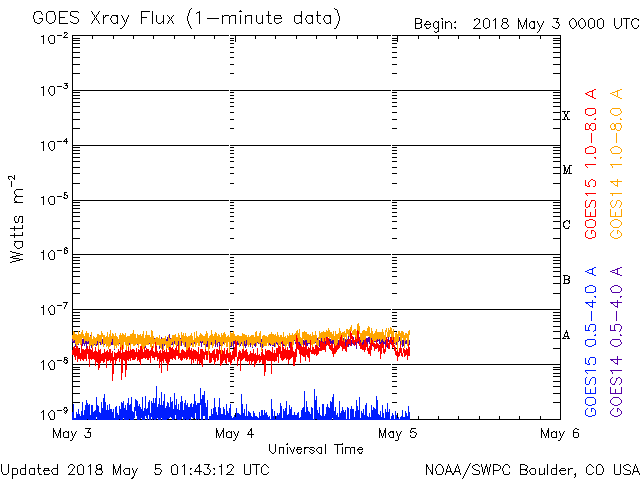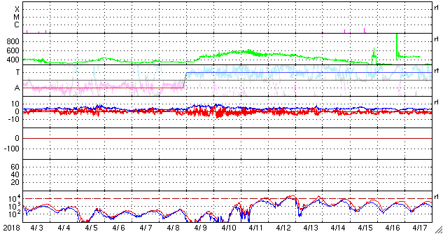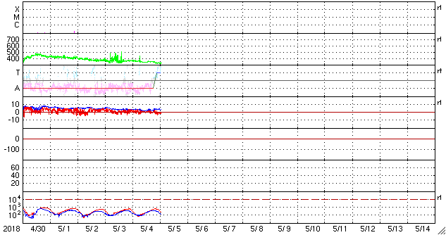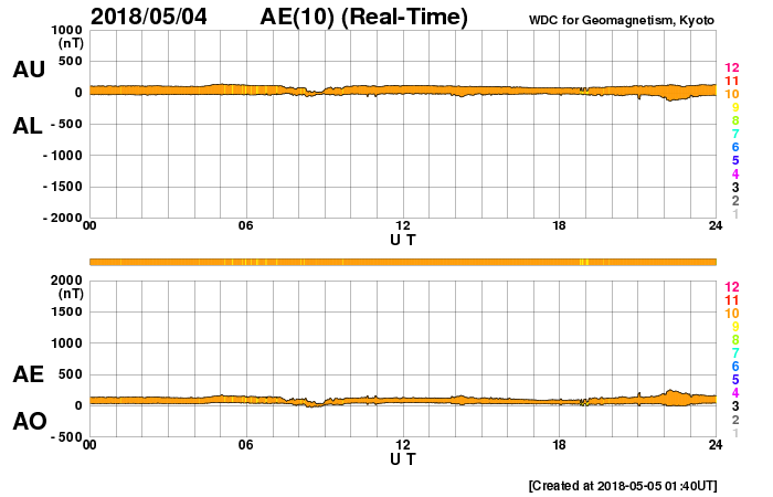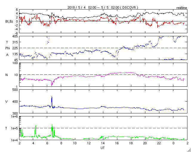 2018/ 5/ 5 10:41 更新 太陽風は低速です。今後、コロナホールの影響が始まりそうです。 担当 篠原 太陽の東側の赤道近くに新しい黒点が現れ、 2708群と番号が付けられています。 X線グラフに変化はなく、 2708群は特に活動は起こしていません。 一方、太陽の東端から活動的な領域が近付いています。 ちょうど見え始めたくらいで、黒点の有無はまだ分かりません。 注目してください。 太陽風は、速度が350km/秒から330km/秒へ下がり、 更に低速になっています。 磁場強度も3〜4nTを推移していて、やや弱い状態です。 磁気圏は静穏で、AE指数は特に変化は起きていません。 太陽風磁場の南北成分を見ると、 グラフの後半から南寄りの傾向になっています。 27日周期の図を見ると、 太陽風磁場の大まかな方向が、 「A」から「T」に切り替わっていて、 この変化の影響かもしれません。 今後も磁場の南寄りの傾向が続くと、 磁気圏の活動は高まりやすくなります。 明日くらいからコロナホールの影響が始まりそうです。 オーロラの活動の変化にも注目してください。 ![]() SDO衛星のAIA193カメラによる太陽コロナの様子 (c) SDO (NASA) ![]() SDO衛星による太陽の可視光写真。マウスの矢印を写真に重ねると、黒点番号付きの写真に切り替わります。 (c) SDO (NASA) ![]() GOES衛星の太陽X線データ (c) NOAA/SWPC ![]() DSCOVRが観測した太陽風の磁場(1番上の枠、黒線は全体の強度、赤線は南北成分) および、太陽風の密度(3番目の紫線)、速度(4番目の青線) (c) データ:NOAA/SWPC、作図:宇宙天気ニュース ![]() AE指数(速報値) 下段のAEグラフの値が高くなると、オーロラ活動が活発化しています。 (c) 京都大学WDC ![]() ![]() 27日の太陽周期に合わせたデータプロット 太陽が同じ面を地球に向けていた27日前の変化から、今後を予想することができます。 (c) 作図:宇宙天気ニュース