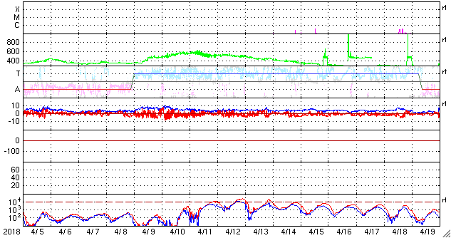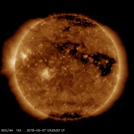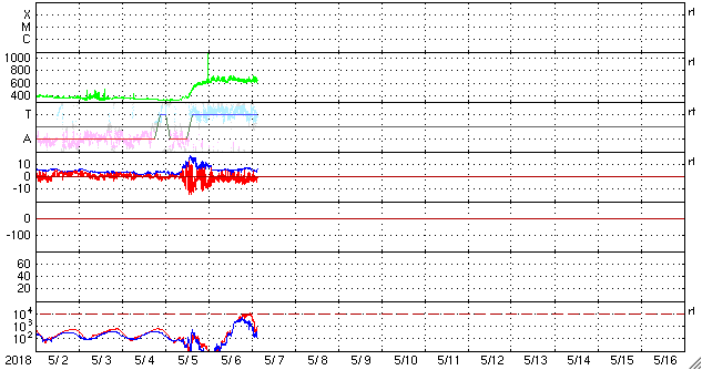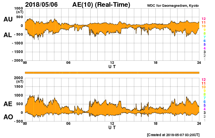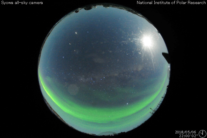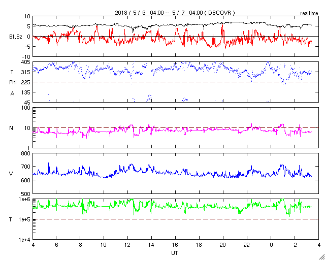 2018/ 5/ 7 12:31 更新 600km/秒台の高速太陽風が続き、磁気圏の活動も活発です。 担当 篠原 太陽風は、650km/秒から630km/秒へ下がり気味ですが、 600km/秒台の高い速度の風が続いています。 コロナホールの影響は続いています。 太陽風の磁場強度は、5nTと平均的な値が続いています。 南北成分は、南寄りの傾向が続き、 -3nT程度の南向きの変化が頻繁に発生しています。 磁気圏の活動は、昨日より少し弱くなっていますが、 AE指数で500〜800nT程度の中規模の活動が続いています。 世界時6日22時、AE指数が900nTに高まった頃のオーロラの様子を、 南極、昭和基地の全天カメラの動画で紹介します。 オーロラが激しく動く時の写真が数分欠けていて残念ですが、 活発なオーロラの様子を見ることができます。 SDO衛星AIA193では、 コロナホールの最後の部分(左端)が太陽の中心線に達しています。 これから、太陽風の高まりは次第に弱くなり、 3〜4日後くらいに終わっている可能性があります。 太陽は、2708黒点群が小さく見えているだけで、 特に活動はありません。 東端の向こう側から活動的な領域が近づいている様で、 SDO衛星AIA193の東端(左端)の赤道付近が少し明るくなっています。
