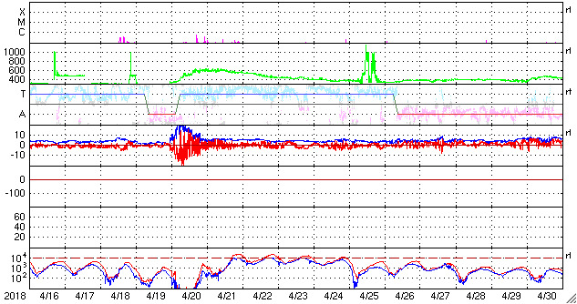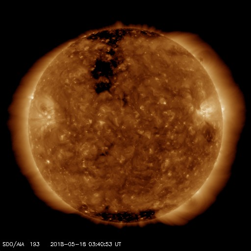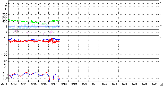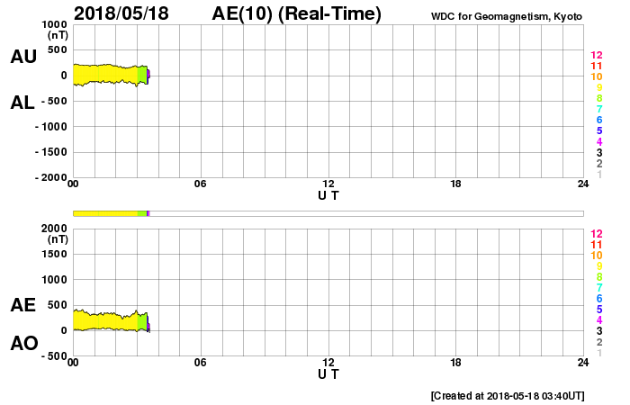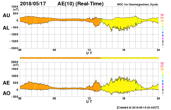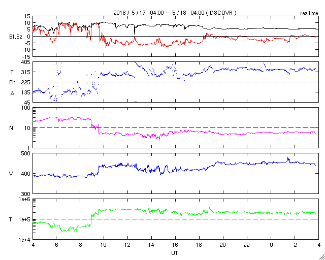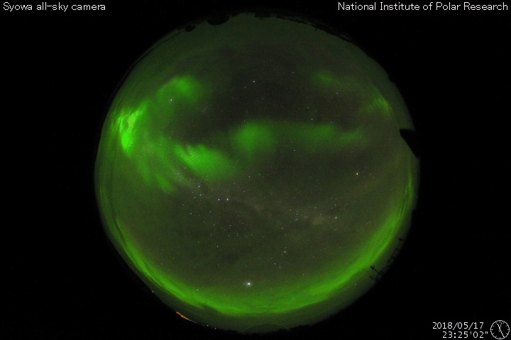 2018/ 5/18 13:00 更新 太陽風がやや高速になっています。磁気圏の活動も高まりました。 担当 篠原 昨日、400km/秒近くに上がっていた太陽風の速度は、 夜になるともう一段上昇して、 450km/秒とやや高速になりました。 磁場強度は、昨夜にかけて10nTに強まり、 速度が高まった後は、ゆっくりと低下して、 現在は5nTと平均的な値に戻っています。 磁場の南北成分は、 昨日のニュースの直後は北向きに振れましたが、 夜になると再び南向きに振れ、 -5〜 -8nTの南向きが8時間続きました。 この影響で磁気圏の活動が強まり、 AE指数は、700〜1000nTの中規模の変化が発生しています。 その後、磁場の南向きは弱くなり、 AE指数の変化も小規模になっていきます。 この頃の活動ですが、昭和基地のオーロラを紹介します。 世界時17日23時半の動画です。 AE指数では目立った変化はありませんが、 昭和基地の上空をオーロラの輝きが彩っています。 今回のコロナホールの影響は、この辺りがピークの様です。 今後、太陽風は次第に弱まって行くでしょう。 太陽は、無黒点で穏やかな状態が続いています。