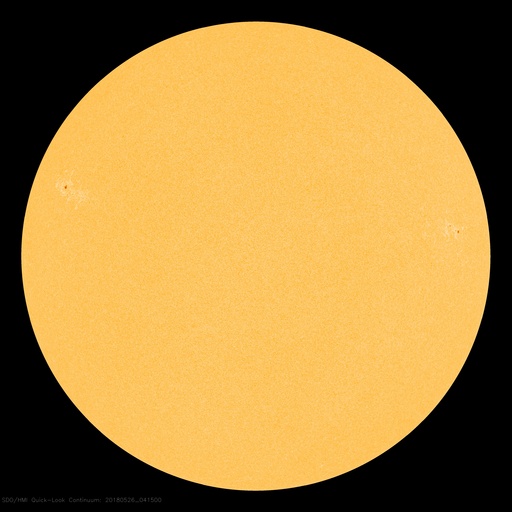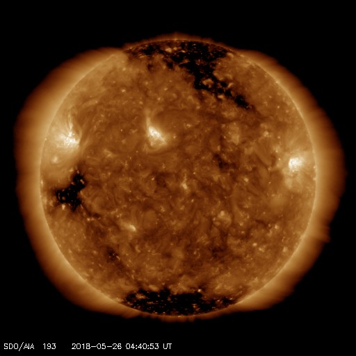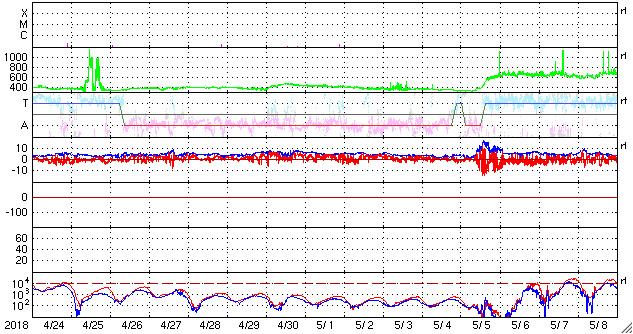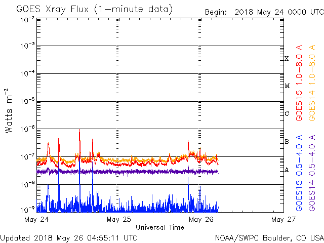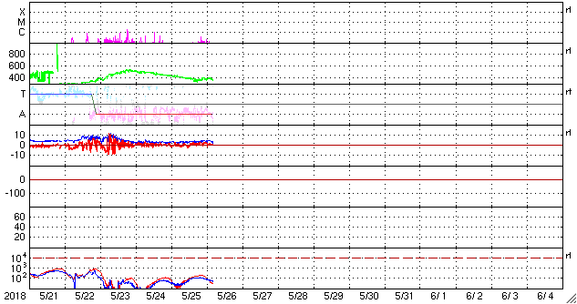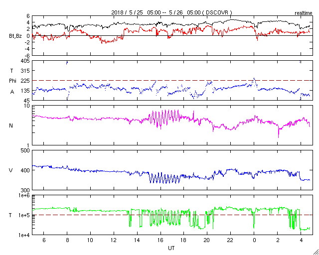 2018/ 5/26 13:56 更新 太陽は穏やかになっています。太陽風も穏やかです。 担当 篠原 太陽は、西(右)に2711黒点群、 東(左)に2710群が見えています。 どちらも活動は弱くなっている様で、 X線グラフの変化は減り、 2711群でB3.7の小さいフレアが起きた程度です。 太陽は、このまま静かな状態が続きそうです。 太陽風は、400〜370km/秒と平均的な速度を保っています。 DSCOVRのグラフでは、 最後で350km/秒に下がる変化が起きていて、 このまま低速の風になるかもしれません。 太陽風の磁場強度は、3〜4nTとやや弱い状態です。 南北成分は、北寄りになっています。 このため磁気圏は穏やかで、 AE指数のグラフはほとんど変化が見られません。