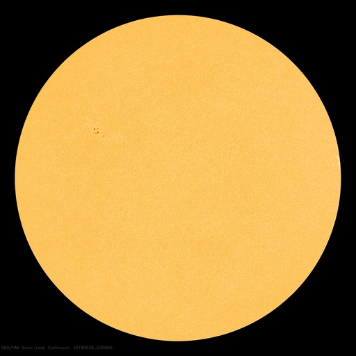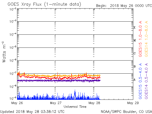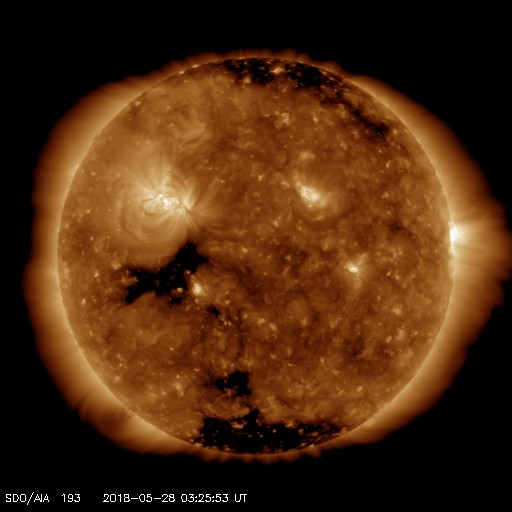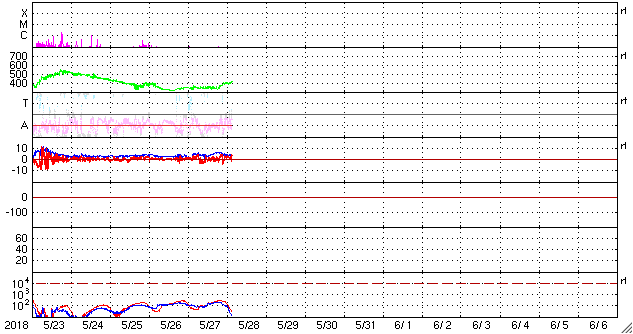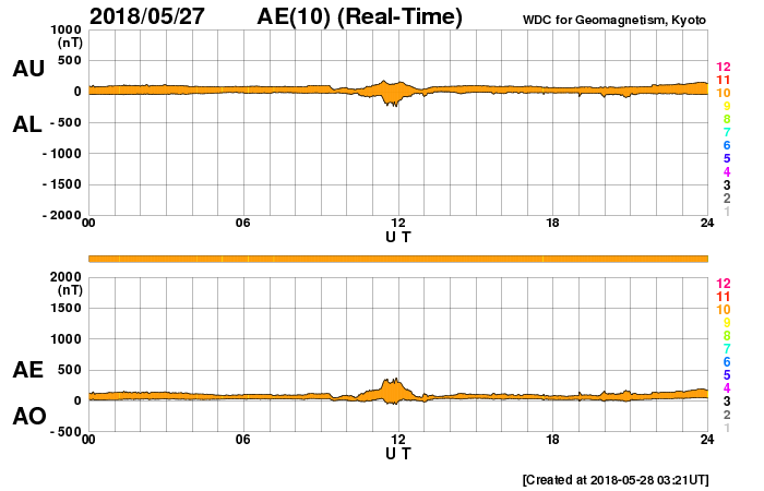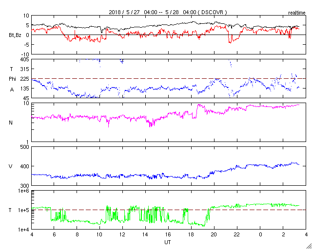 2018/ 5/28 12:38 更新 太陽風は平均的な状態になっています。磁気圏は穏やかです。 担当 篠原 太陽は、2711黒点群が西に沈んで見えなくなり、 2712群だけになっています。 その2712群は、黒点の数が増えていますが、 X線グラフに変化はなく、穏やかな状態が続いています。 太陽風は、昨日のニュースの頃に小さい変化が見られましたが、 磁場強度は、その後も5nT前後で推移しています。 一方、速度は350km/秒に戻り、低速の風が続きました。 そして、今朝くらいからゆっくり上昇して、 現在は400km/秒と平均的な速度に上がっています。 どちらも小幅の変化で、 基本的に太陽風は穏やかに推移しています。 太陽風磁場の南北成分は、 比較的北寄りに推移しています。 磁気圏も穏やかで、AE指数には目立った変化は起きていません。 SDO衛星AIA193では、 赤道付近のコロナホールが太陽の中心線に近付いています。 明日くらいに中心線に達して、 その3日後くらいから太陽風に影響が始まると考えると、 6月1〜2日頃となりそうです。