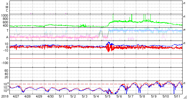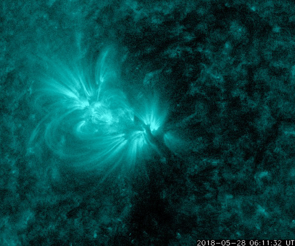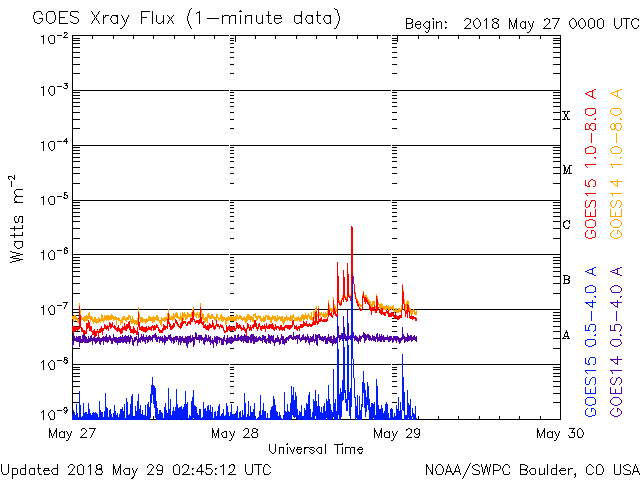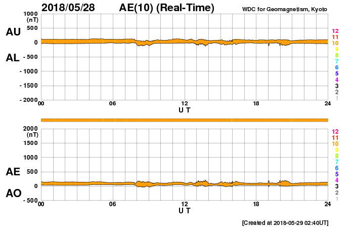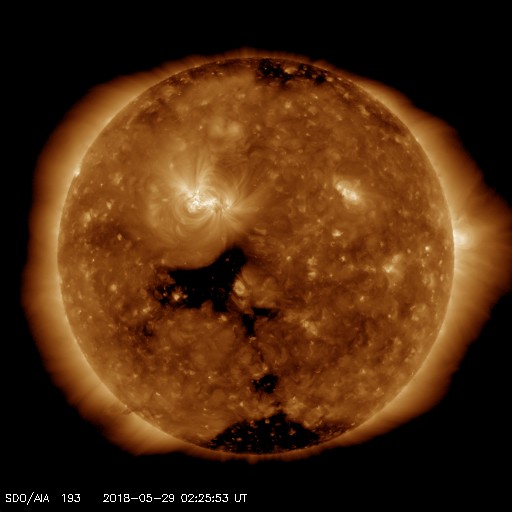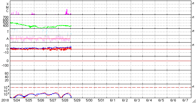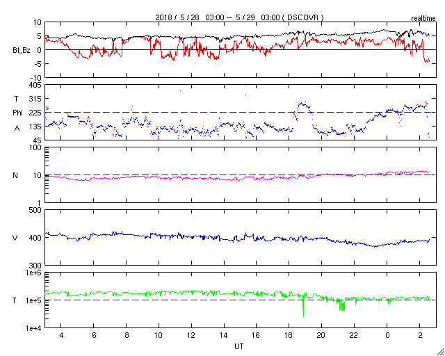 2018/ 5/29 11:45 更新 太陽でC2.7の小規模フレアが発生しました。 担当 篠原 今日の未明、29日2時(世界時28日17時)に、 太陽の中央部の2712黒点群で、 C2.7の小規模フレアが発生しました。 2712黒点群は、 太陽の東端に現れた直後の5月24日(日本時間)にも C2.8の小規模フレアを起こしていて、 5日ぶりに、ほぼ同じ規模のフレアを起こしたことになります。 SDO衛星AIA131による動画を掲載します。 短時間のフレアだったので、輝きは一瞬しか見えません。 X線グラフを見ると、 C2.7のフレアの前に、 Bクラスの小さいフレアが何度も発生しています。 一方、Cフレアの後は、変化がほとんどなくなり、 2712群は落ち着いている様です。 可視光写真では、 2712群は黒点の見え方も少し大きくなっています。 小さい活動ですが、引き続き変化に注目して下さい。 太陽風は、速度が400km/秒から380km/秒にやや下がっていますが、 平均的な速さが続いています。 磁場強度も、5nTと平均的な状態です。 磁場の南北成分は、北寄りの傾向が続いていて、 磁気圏は穏やかです。 AE指数はほとんど変化が見られません。 SDO衛星AIA193の太陽コロナ写真では、 中央部のコロナホールの先頭(右端)が、 太陽の中心線に達しています。 3日後の6月1日くらいから、次の太陽風の高まりが始まりそうです。 ![]() 2712黒点群で発生したC2.7の小規模フレア。SDO衛星AIA131。 (c) SDO (NASA)、(動画加工 : 宇宙天気ニュース) ![]() SDO衛星のAIA193カメラによる太陽コロナの様子 (c) SDO (NASA) ![]() SDO衛星による太陽の可視光写真。マウスの矢印を写真に重ねると、黒点番号付きの写真に切り替わります。 (c) SDO (NASA) ![]() GOES衛星の太陽X線データ (c) NOAA/SWPC ![]() DSCOVRが観測した太陽風の磁場(1番上の枠、黒線は全体の強度、赤線は南北成分) および、太陽風の密度(3番目の紫線)、速度(4番目の青線) (c) データ:NOAA/SWPC、作図:宇宙天気ニュース ![]() AE指数(速報値) 下段のAEグラフの値が高くなると、オーロラ活動が活発化しています。 (c) 京都大学WDC ![]() ![]() 27日の太陽周期に合わせたデータプロット 太陽が同じ面を地球に向けていた27日前の変化から、今後を予想することができます。 (c) 作図:宇宙天気ニュース