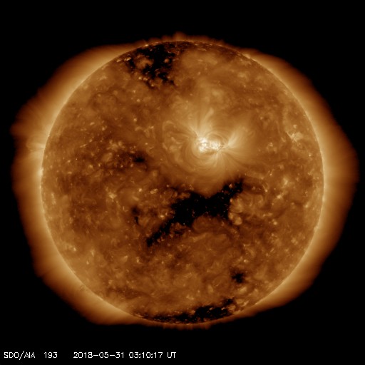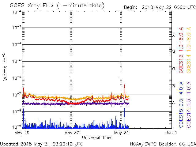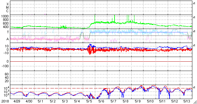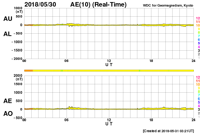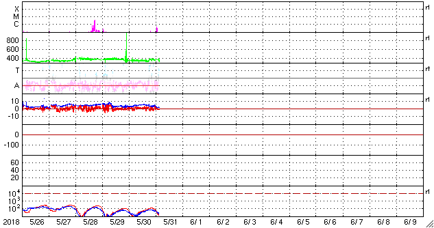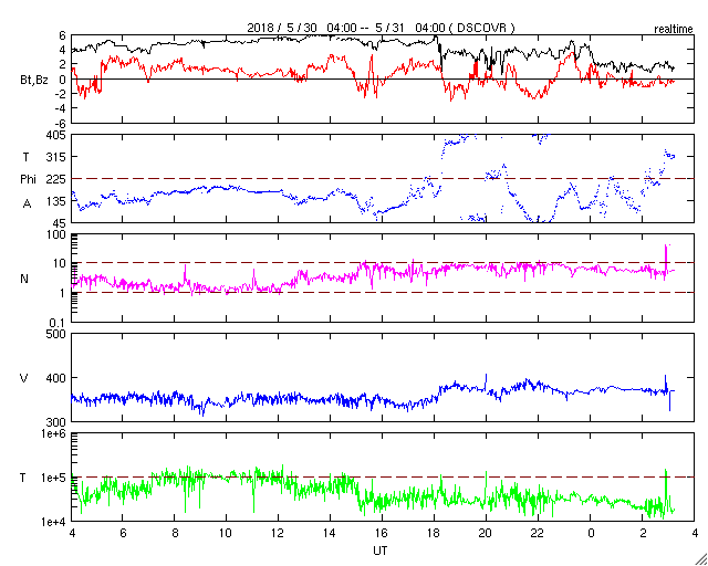 2018/ 5/31 12:30 更新 太陽風は低速で、磁気圏は穏やかです。 担当 篠原 太陽風は、350〜380km/秒と低速の状態で推移しています。 磁場強度は、昨夜にかけて5nTに戻っていましたが、 今日に入ると次第に弱まり、現在は2nTに下がっています。 セクターの切り替わりが近付いているのかもしれません。 磁気圏はとても穏やかで、 AE指数のグラフはほとんど変化が見られません。 SDO衛星AIA193の太陽コロナ写真では、 中央部のコロナホールが西に進み、 影響の始まるタイミングが近付いています。 27日周期の図では、 前周期は5月5日のグラフに変化が現れています。 今回はどの様な高まりがやって来るのか、 来週にかけて、太陽風の変化に注目して下さい。 太陽の2712黒点群では、 また少し黒点が目立つ様になっています。 X線グラフでも、 今朝、Bクラスの小さいフレアを起こしています。 黒点群は、この後どの様に変化するでしょうか。