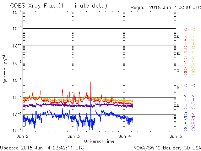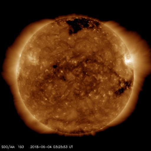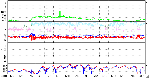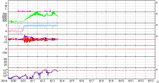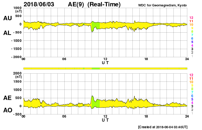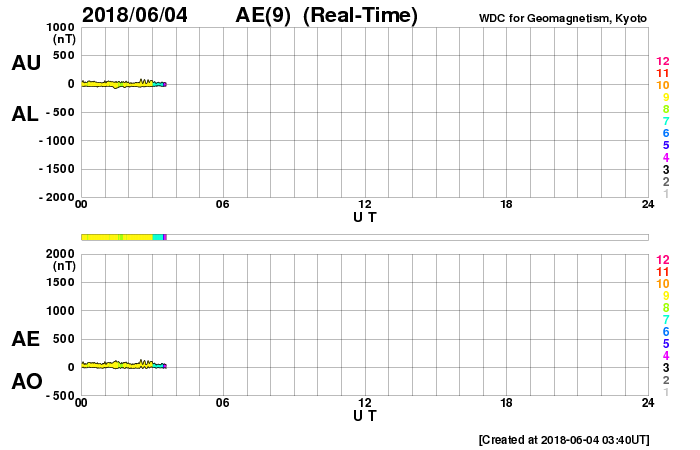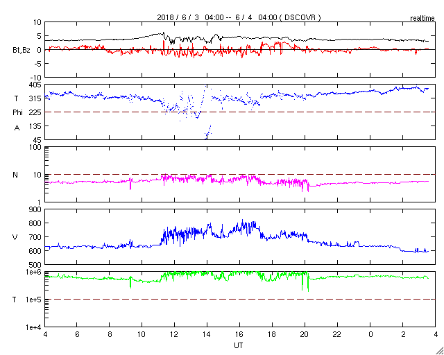 2018/ 6/ 4 12:41 更新 太陽風は600km/秒の高い速度が続いています。太陽はほぼ無黒点です。 担当 篠原 太陽風の速度は、 昨夜から今朝にかけて再び700km/秒に高まる変化が発生しています。 現在はその高まりは通り過ぎて、600km/秒に戻っています。 太陽風は、依然高い速度を保っています。 太陽風の磁場強度は、3〜4nTを推移しています。 南北成分は、0nT付近で小さく変化する様になり、 高速風は続いていますが、 磁気圏の活動度はそれほど高くなく、 AE指数は500nT弱の小規模の変化になっています。 高速太陽風は、到来して4日目に入っています。 SDO衛星AIA193の太陽コロナ写真では、 コロナホールは太陽の西の端に去りつつあり、 この後、影響は弱まっていきそうです。 一方。27日周期の図を見ると、 前周期の高速風は5月11日まで続きました。 今回では、6月7日に相当します。 コロナホールの広がりに変化が見られるので、 終わりのタイミングは早まるかもしれません。 2712黒点群は、昨日見えていた黒点が小さくなり、 SDO衛星の拡大写真でかろうじて見える程度になっています。 一方、X線グラフでは、最大でB7.9の変化も起きていて、 小さいですが、活動が続いています。 放射線帯の高エネルギー電子は、 昨日と同程度で、1万を超えた状態が続いています。 ![]() SDO衛星のAIA193カメラによる太陽コロナの様子 (c) SDO (NASA) ![]() SDO衛星による太陽の可視光写真。マウスの矢印を写真に重ねると、黒点番号付きの写真に切り替わります。 (c) SDO (NASA) ![]() DSCOVRが観測した太陽風の磁場(1番上の枠、黒線は全体の強度、赤線は南北成分) および、太陽風の密度(3番目の紫線)、速度(4番目の青線) (c) データ:NOAA/SWPC、作図:宇宙天気ニュース ![]() AE指数(速報値) 下段のAEグラフの値が高くなると、オーロラ活動が活発化しています。 (c) 京都大学WDC ![]() ![]() 27日の太陽周期に合わせたデータプロット 太陽が同じ面を地球に向けていた27日前の変化から、今後を予想することができます。 (c) 作図:宇宙天気ニュース