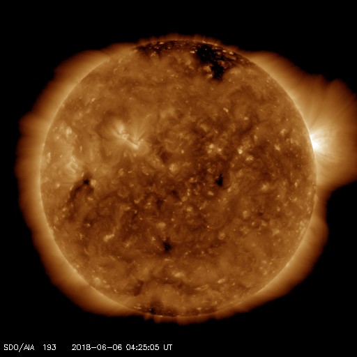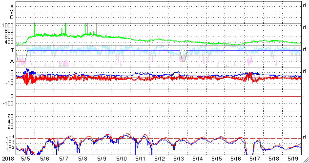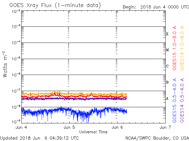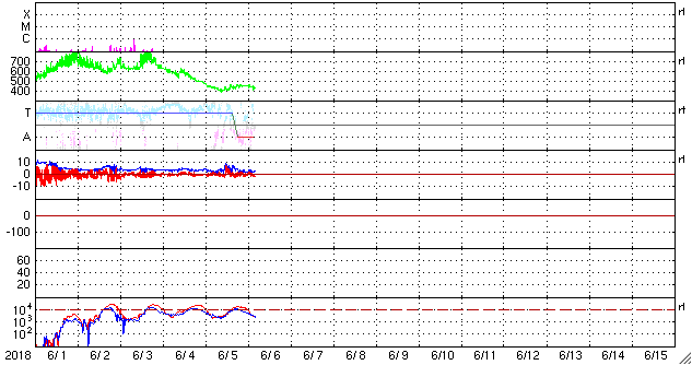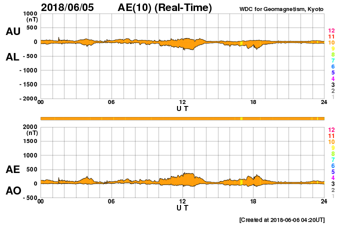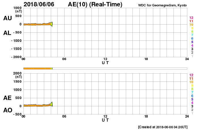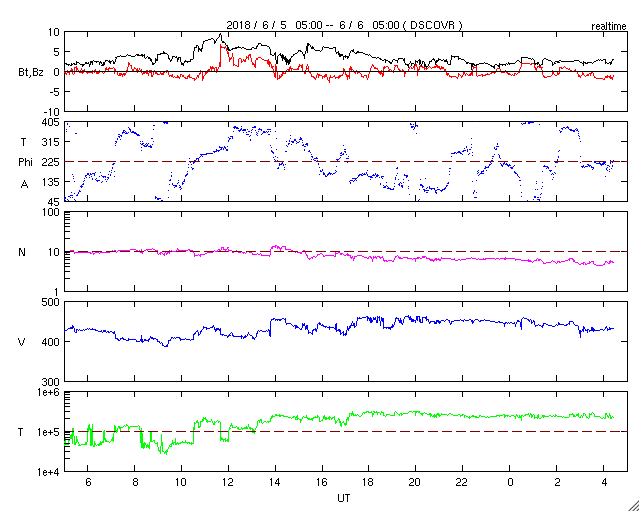 2018/ 6/ 6 13:40 更新 太陽風は平均的な速度で、磁気圏も穏やかです。太陽は無黒点です。 担当 篠原 高速太陽風の領域を通り過ぎ、 太陽風は、400〜450km/秒の速度で推移しています。 磁場強度は、3nTから7nTくらいに強まり、 また3nTに戻る変化をしています。 27日周期の図を見ると、 セクターの切り替わり(「T」から「A」へ)が起きています。 しかし、前周期にはここで変化は起きていません。 このまま落ち着くのか、また戻るのか、 しばらく注目してください。 太陽風磁場の南北成分は、0nT付近で小さく変化しています。 磁気圏は概ね静穏で、 AE指数は、200〜300nTの小規模の変化が 2回ほど起きている程度です。 SDO衛星AIA193の太陽コロナ写真では、 コロナホールは見えなくなっています。 太陽風は穏やかな状態が続きそうです。 太陽は、2712黒点群の領域も西の端に沈み、 無黒点になっています。 X線グラフも変化は見られません。 放射線帯の高エネルギー電子は、 1万に高まった状態が続いています。 少しずつ下がっていて、 GOES14(青線)は、そろそろ1万を割りそうです。