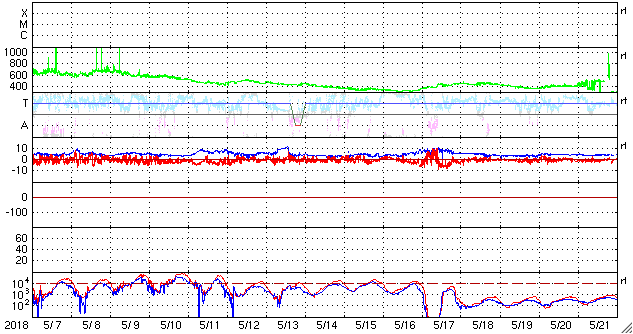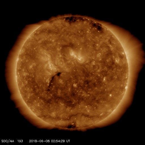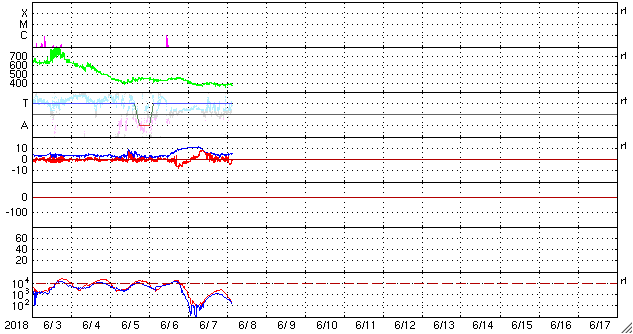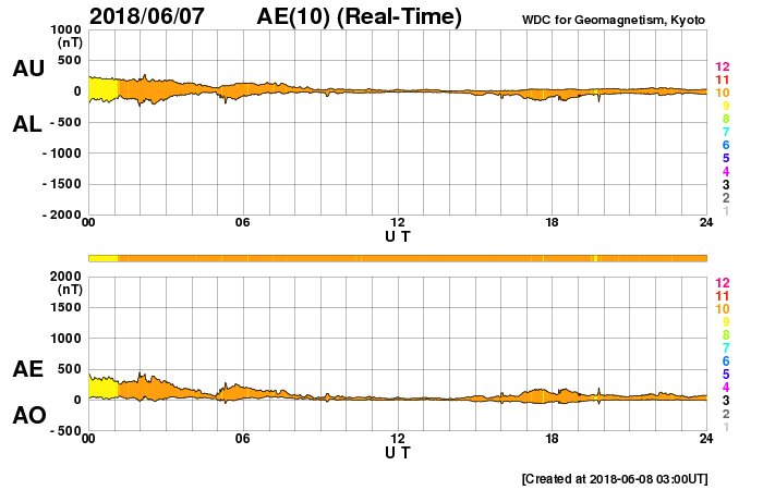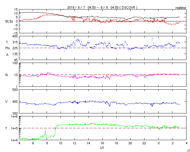 2018/ 6/ 8 12:11 更新 太陽風磁場の強まりは通り過ぎ、磁気圏も穏やかになっています。 担当 篠原 太陽風の速度は、 400km/秒から380km/秒へ少し下がっています。 低速風に変わりかけているのかもしれません。 一方、10nTに強まっていた磁場強度は、 昨夜遅くに5nTに下がり、以降安定しています。 太陽風磁場の強まりは通り過ぎた様です。 磁場の南北成分は、 磁場が強まっていた頃は、北向きに強まっていましたが、 その後は0nT近付近と、変化は小さくなっています。 磁気圏は穏やかで、AE指数は特に変化はありません。 SDO衛星AIA193の太陽コロナ写真では、 コロナホールは見られず、 太陽風は穏やかな状態が続きそうです。 太陽は、昨日見えていた小さい黒点は、 その後すぐに消えて、番号は付かないままになっています。 太陽は無黒点です。 2712黒点群が沈んだ影響で、 X線グラフは全体の強度も少し下がっています。 ![]() SDO衛星のAIA193カメラによる太陽コロナの様子 (c) SDO (NASA) ![]() SDO衛星による太陽の可視光写真 (c) SDO (NASA) ![]() DSCOVRが観測した太陽風の磁場(1番上の枠、黒線は全体の強度、赤線は南北成分) および、太陽風の密度(3番目の紫線)、速度(4番目の青線) (c) データ:NOAA/SWPC、作図:宇宙天気ニュース ![]() AE指数(速報値) 下段のAEグラフの値が高くなると、オーロラ活動が活発化しています。 (c) 京都大学WDC ![]() ![]() 27日の太陽周期に合わせたデータプロット 太陽が同じ面を地球に向けていた27日前の変化から、今後を予想することができます。 (c) 作図:宇宙天気ニュース