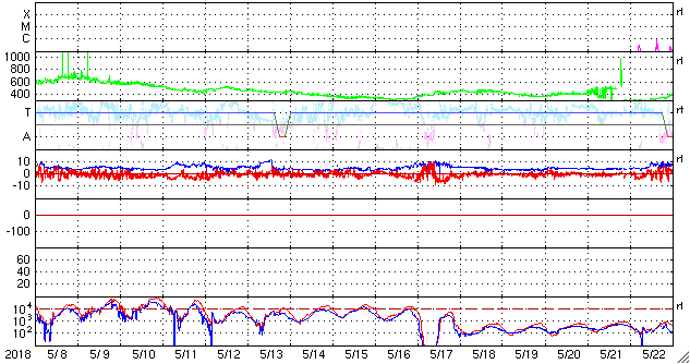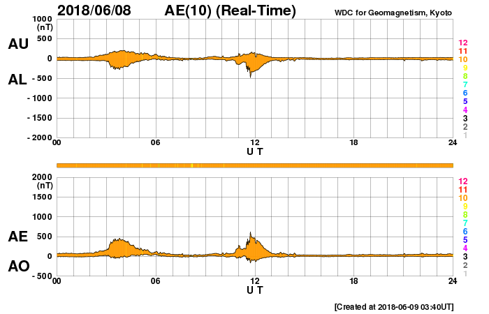 下段のAEグラフの値が高くなると、オーロラ活動が活発化しています。