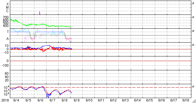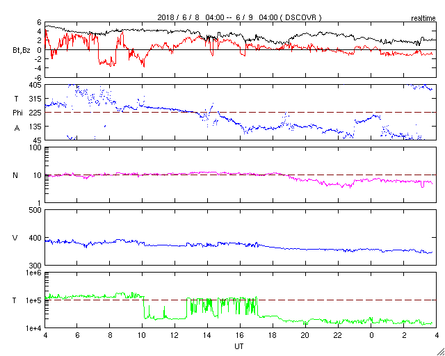 - 2018/ 6/ 8 12:11 太陽風磁場の強まりは通り過ぎ、磁気圏も穏やかになっています。