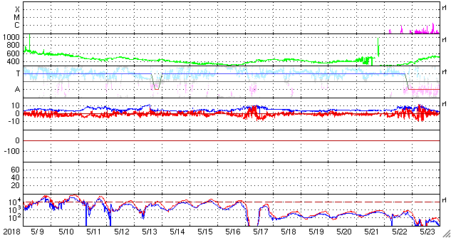 磁場強度は、3nT前後でやや弱い状態です。