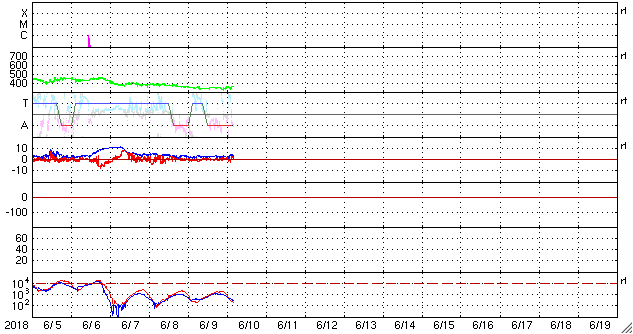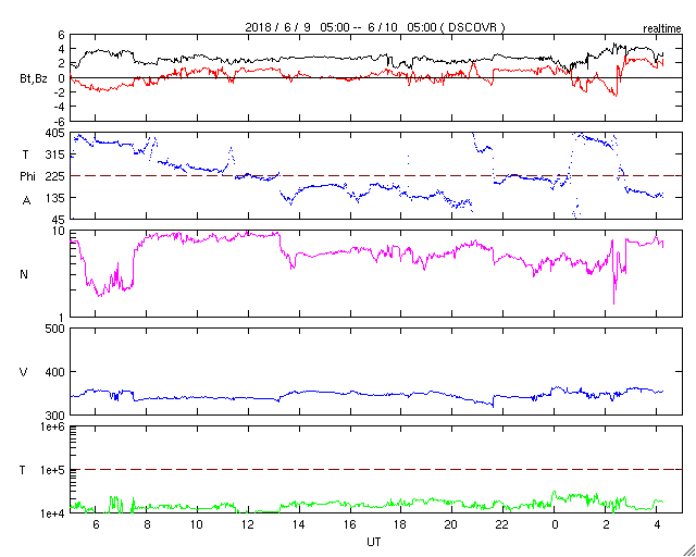 - 2018/ 6/ 9 12:57 太陽風は低速になり、磁気圏も穏やかです。