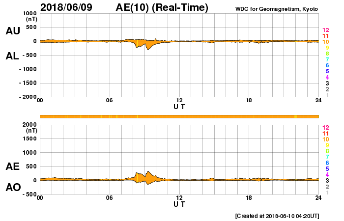 下段のAEグラフの値が高くなると、オーロラ活動が活発化しています。