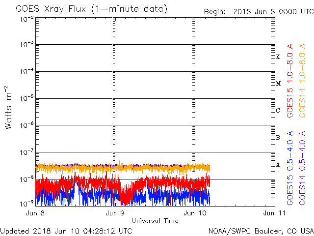 - 2018/ 6/ 7 12:49 西に沈んだ2712黒点群でC1.0の小規模フレアが発生しました。5月の黒点相対数は 13.2 でした。