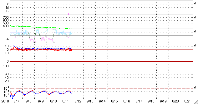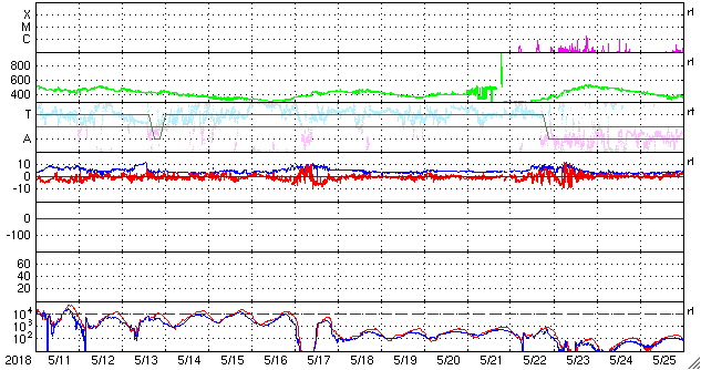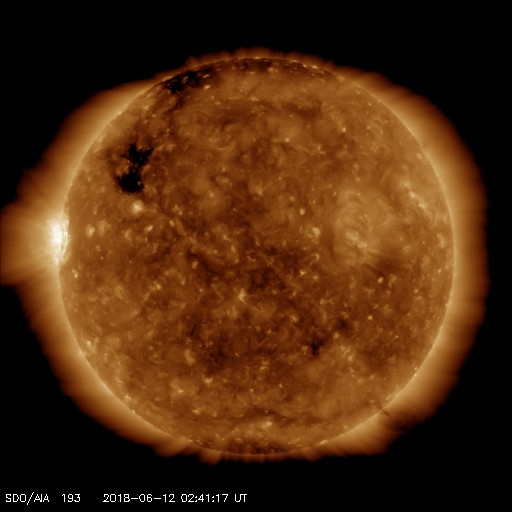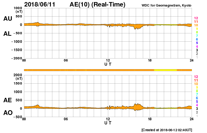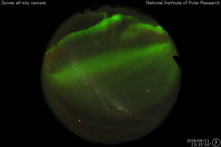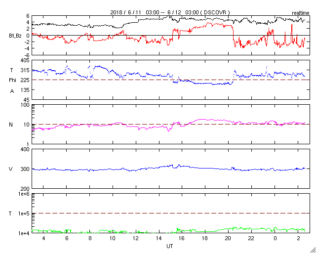 2018/ 6/12 11:49 更新 太陽風は低速の風が続いています。太陽の東端から活動的な領域が見えてきました。 担当 篠原 太陽風は、300km/秒と低速の風が続いています。 磁場強度は、3nTから5nTに少し上がり、 平均的な状態に戻っています。 磁場の南北成分は、 今朝早くから、南向きの-3nT程度の状態が続いています。 太陽風の速度が下がっていることもあり、 AE指数では目立った変化は発生していませんが、 南極の昭和基地の全天カメラでは、 オーロラの活動も撮影されています。 世界時11日23時半頃の様子を紹介します。 SDO衛星AIA193では、 太陽の中央部にコロナホールはありませんが、 北東側(左上)に薄暗い領域が見えています。 27日前の前周期は、ここにコロナホールがあり、 27日周期の図の5月23〜24日の太陽風速度の高まりをもたらしました。 今回は、6月19〜20日頃になりそうですが、 現在のコロナホールの広がりはどうなっているでしょうか。 太陽は、東端から活動的な領域が近づいていますが、 まだ、黒点は見えない様です。 X線グラフでは、Bクラスの小さい変化も起きています。 今後、どのような活動を起こすでしょうか。