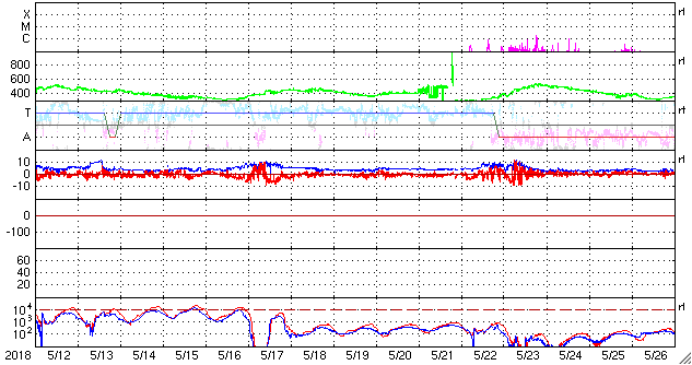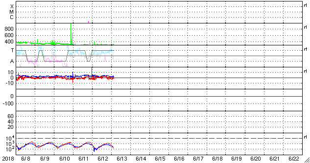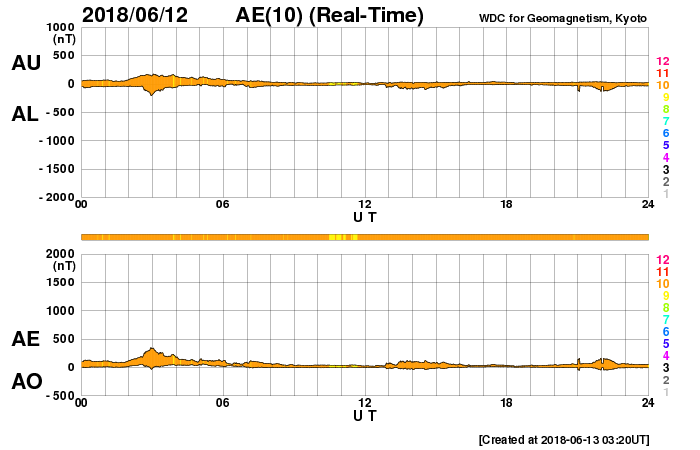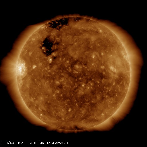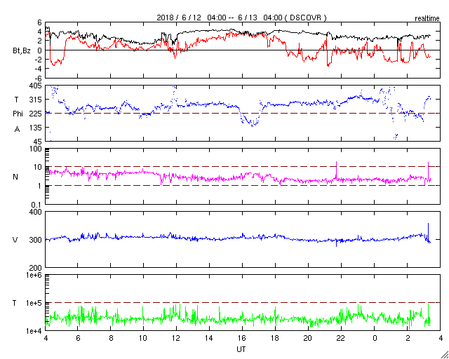 2018/ 6/13 12:31 更新 300km/秒と低速の太陽風が続いています。太陽の東端から黒点が現れました。 担当 篠原 太陽風は、300km/秒と低速の状態で安定しています。 磁場強度は、2〜4nTとやや弱い値に戻っています。 穏やかな太陽風が続いています。 太陽風磁場の南北成分は、 グラフの後半で弱い南寄りになっていますが、 速度が下がっていることもあり、磁気圏は静穏で、 AE指数のグラフは、 時々、小さい変化が発生している程度です。 SDO衛星AIA193では、 太陽の東側の中緯度域のコロナホールが 良く見える様になってきました。 前周期と同じくらいの広がりになっている様で、 27日周期の図の前周期の5月23〜24日の様な 太陽風の高まりをもたらすかもしれません。 太陽の東端から現れた黒点は、 2713群と番号が付きました。 X線グラフは、 Bクラスに達する変化が2回起きている程度です。 新しい領域の活動度は低い様です。 ![]() SDO衛星のAIA193カメラによる太陽コロナの様子 (c) SDO (NASA) ![]() SDO衛星による太陽の可視光写真。マウスの矢印を写真に重ねると、黒点番号付きの写真に切り替わります。 (c) SDO (NASA) ![]() DSCOVRが観測した太陽風の磁場(1番上の枠、黒線は全体の強度、赤線は南北成分) および、太陽風の密度(3番目の紫線)、速度(4番目の青線) (c) データ:NOAA/SWPC、作図:宇宙天気ニュース ![]() AE指数(速報値) 下段のAEグラフの値が高くなると、オーロラ活動が活発化しています。 (c) 京都大学WDC ![]() ![]() 27日の太陽周期に合わせたデータプロット 太陽が同じ面を地球に向けていた27日前の変化から、今後を予想することができます。 (c) 作図:宇宙天気ニュース