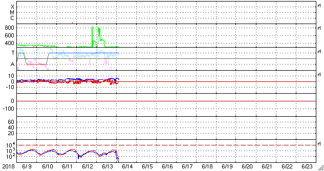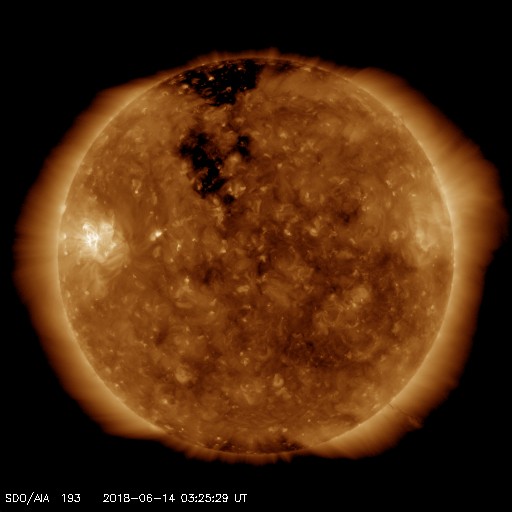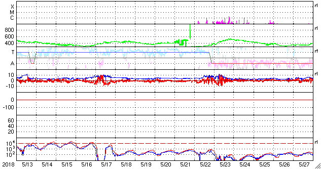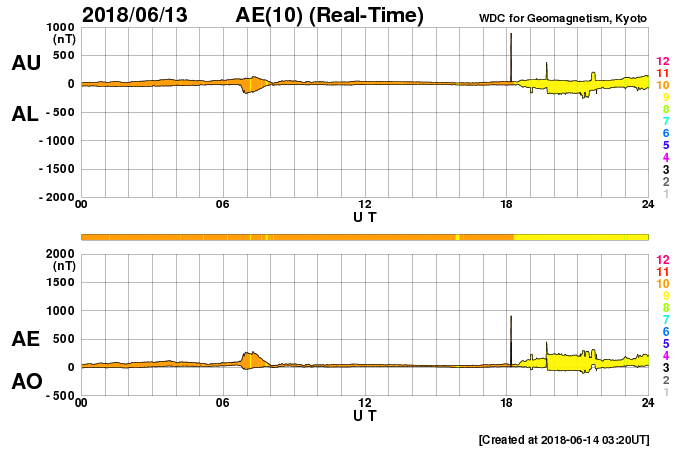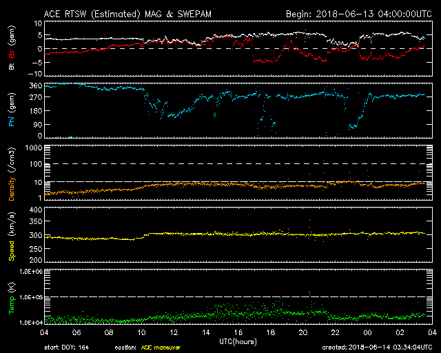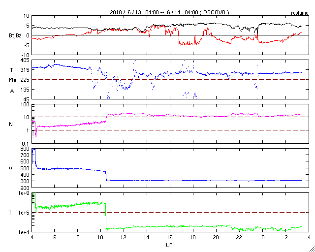 2018/ 6/14 12:31 更新 太陽風は低速ですが、磁場の変化で磁気圏の弱い活動が発生しています。 担当 篠原 DSCOVR衛星の太陽風速度のグラフの 前半のデータに乱れがあるので、 ACE衛星のグラフも参考に掲載します。 太陽風の速度は、300km/秒の低速の状態で安定しています。 磁場強度は、グラフの後半から6nTに少し強まっています。 磁場の南北成分の変化も、 この頃から振れ幅が少し大きくなり、 -5nT程度の南向きの変化も発生しています。 このため、磁気圏の活動が少し高まって、 AE指数に200nTくらいの小規模の変化が発生しています。 27日周期の図を見ると、太陽風磁場の変化は小規模で、 太陽風は、基本的には穏やかな状態が続いています。 SDO衛星AIA193の太陽コロナ写真では、 北半球のコロナホールは、太陽の中心線に近付いています。 この領域の影響が始まるまで、低速の太陽風は続きそうです。 太陽の2713黒点群は、 フレアの発生などは特になく、穏やかな状態です。 ![]() SDO衛星のAIA193カメラによる太陽コロナの様子 (c) SDO (NASA) ![]() SDO衛星による太陽の可視光写真。マウスの矢印を写真に重ねると、黒点番号付きの写真に切り替わります。 (c) SDO (NASA) ![]() DSCOVRが観測した太陽風の磁場(1番上の枠、黒線は全体の強度、赤線は南北成分) および、太陽風の密度(3番目の紫線)、速度(4番目の青線) (c) データ:NOAA/SWPC、作図:宇宙天気ニュース ![]() ACEが観測した太陽風の磁場(1番上の枠、白線は全体の強度、赤線は南北成分) および、太陽風の密度(3番目の橙線)、速度(4番目の黄線) (c) NOAA/SWPC ![]() AE指数(速報値) 下段のAEグラフの値が高くなると、オーロラ活動が活発化しています。 (c) 京都大学WDC ![]() ![]() 27日の太陽周期に合わせたデータプロット 太陽が同じ面を地球に向けていた27日前の変化から、今後を予想することができます。 (c) 作図:宇宙天気ニュース