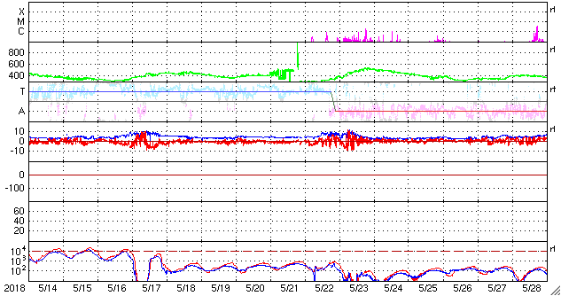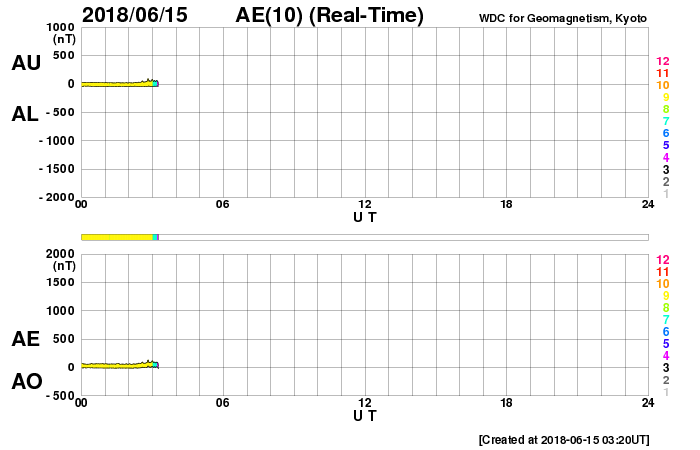 (c) SOHO (ESA & NASA)、 (動画加工 : 宇宙天気ニュース) ![]() SDO衛星のAIA193カメラによる太陽コロナの様子 (c) SDO (NASA) ![]() SDO衛星による太陽の可視光写真。マウスの矢印を写真に重ねると、黒点番号付きの写真に切り替わります。 (c) SDO (NASA) ![]() GOES衛星の太陽X線データ (c) NOAA/SWPC ![]() DSCOVRが観測した太陽風の磁場(1番上の枠、黒線は全体の強度、赤線は南北成分) および、太陽風の密度(3番目の紫線)、速度(4番目の青線) (c) データ:NOAA/SWPC、作図:宇宙天気ニュース ![]() AE指数(速報値) 下段のAEグラフの値が高くなると、オーロラ活動が活発化しています。 (c) 京都大学WDC ![]() ![]() 27日の太陽周期に合わせたデータプロット 太陽が同じ面を地球に向けていた27日前の変化から、今後を予想することができます。 (c) 作図:宇宙天気ニュース