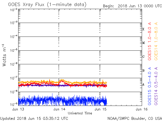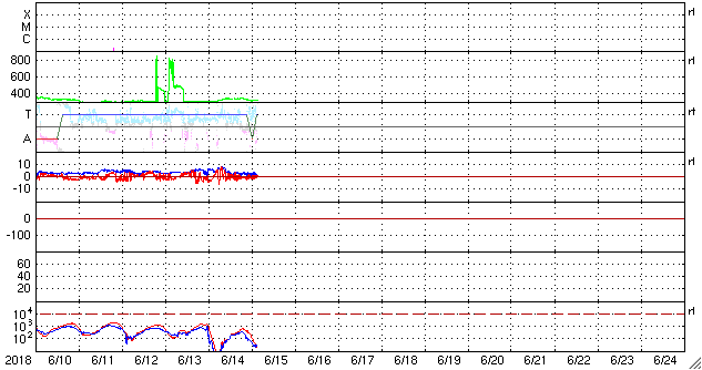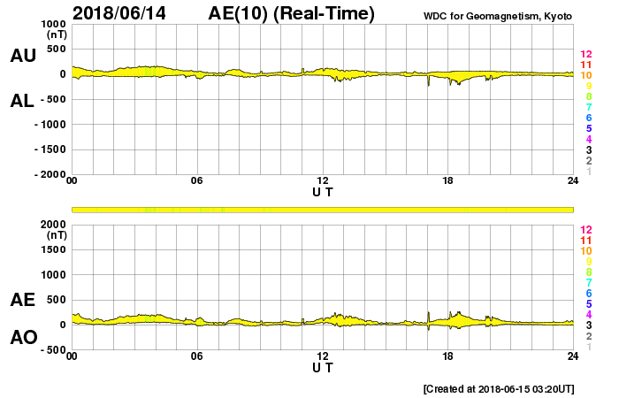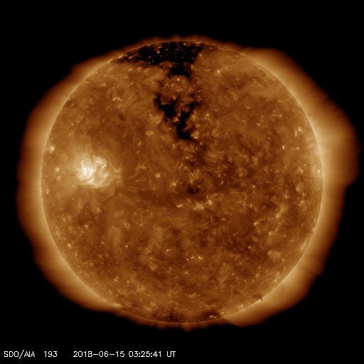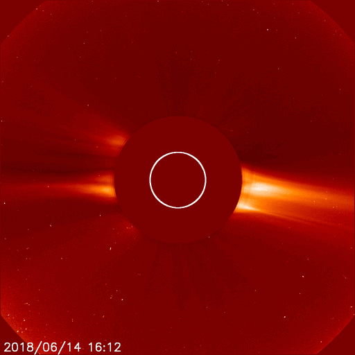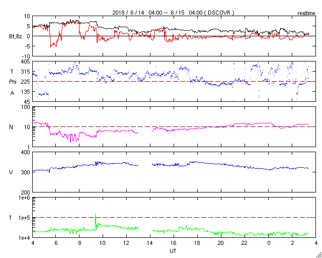 2018/ 6/15 12:31 更新 太陽の向こう側でCMEが発生しています。太陽風は低速です。 担当 篠原 今日未明、15日2時(世界時14日17時)頃に、 太陽の西の端(右端)から CME(太陽ガスの放出現象)が噴出しています。 SOHO衛星LASCO C2、C3による動画を掲載します。 SDO衛星やSTEREO衛星の画像の様子から、 太陽の向こう側で発生した爆発現象の様です。 地球への影響はありません。 こちら側の太陽面は、2713黒点群が見えていますが、 特に活動はなく、穏やかな状態です。 太陽風は、速度が300km/秒から340km/秒へ上がり、 再び300km/秒へ下がる小幅の変化をしています。 低速の風は続いています。 一方、6nTに少し強まっていた磁場強度は、 昨夜以降弱くなり、現在は1〜2nTに下がっています。 磁気圏は、基本的には穏やかですが、 AE指数には小さい変化も見えています。 SDO衛星AIA193の太陽コロナ写真では、 北極から縦に伸びるコロナホールが、 ちょうど太陽の中心線に達しています。 3〜4日後の18〜19日くらいから、 太陽風の高まりが見られるかもしれません。