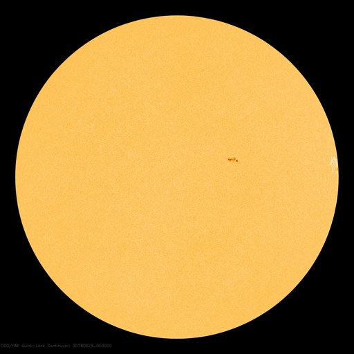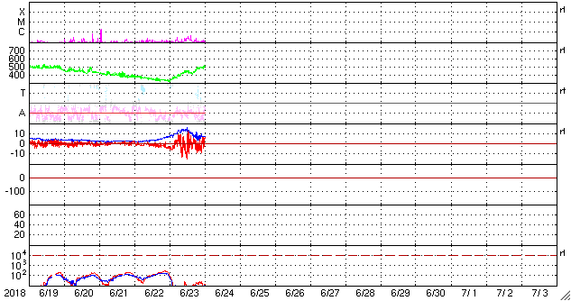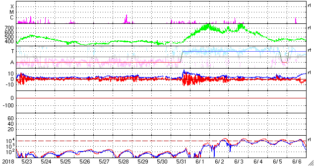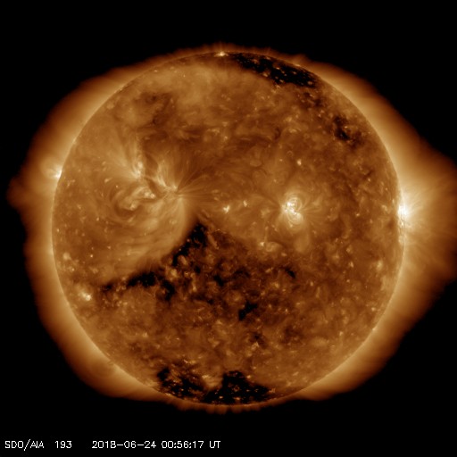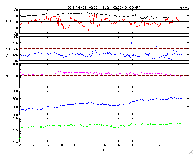2018/ 6/24 10:03 更新 太陽風の速度が500km/秒に高まっています。磁気圏も活動的です。 担当 篠原 太陽風は、磁場強度の高まりに続いて、 速度の上昇も始まりました。 昨夕、23日17時(世界時23日8時)には、 400km/秒と平均的な速度に上がり、 今日に入った頃から更に上昇を始めて、 今朝、24日8時(世界時23日23時)には、 500km/秒と高速の状態に達しています。 反対に、13nTまで強まっていた磁場強度は、 速度の高まりとともに下がり始めていますが、 現在も7nTとやや強まった状態です。 コロナホールの影響は、前周期と違って、 太陽風のはっきりとした高まりとして到来しています。 この後どの様に推移するのか、注目してください。 太陽風磁場の南北成分は、 -10nTと大きな南向きの変化も発生しています。 磁気圏の活動も活発になり、 AE指数は、700〜1000nTの中規模の変化が何度も発生しています。 太陽風の磁場強度は下がってきましたが、速度は高まっているので、 南向きの変化が続けば、磁気圏の高まった状態も続くでしょう。 SDO衛星AIA193では、 太陽の東側(左側)から進んできたコロナホールは、 これまで濃く見えていた領域は中心線に近付き、 4日後くらいから太陽風に変化が始まりそうです。 一方、今日の写真では、その右側に向かっても、 淡くコロナホールが広がっている様に見えます。 この領域からの影響も到来するのであれば、 変化の始まりは早くなるかもしれません。 太陽は、2713黒点群が西の端に近付き、 この後見えなくなりそうです。 中央の2715群は、昨日よりも少し小さくなっています。 X線グラフは、Bクラスの小さい変化が頻発していますが、 前半は中央の2715群、後半は西の2713群で発生している様です。 ![]() SDO衛星のAIA193カメラによる太陽コロナの様子 (c) SDO (NASA) ![]() SDO衛星による太陽の可視光写真。マウスの矢印を写真に重ねると、黒点番号付きの写真に切り替わります。 (c) SDO (NASA) ![]() DSCOVRが観測した太陽風の磁場(1番上の枠、黒線は全体の強度、赤線は南北成分) および、太陽風の密度(3番目の紫線)、速度(4番目の青線) (c) データ:NOAA/SWPC、作図:宇宙天気ニュース ![]() AE指数(速報値) 下段のAEグラフの値が高くなると、オーロラ活動が活発化しています。 (c) 京都大学WDC ![]() ![]() 27日の太陽周期に合わせたデータプロット 太陽が同じ面を地球に向けていた27日前の変化から、今後を予想することができます。 (c) 作図:宇宙天気ニュース