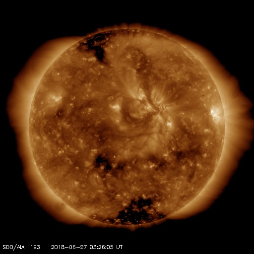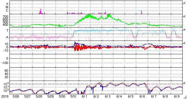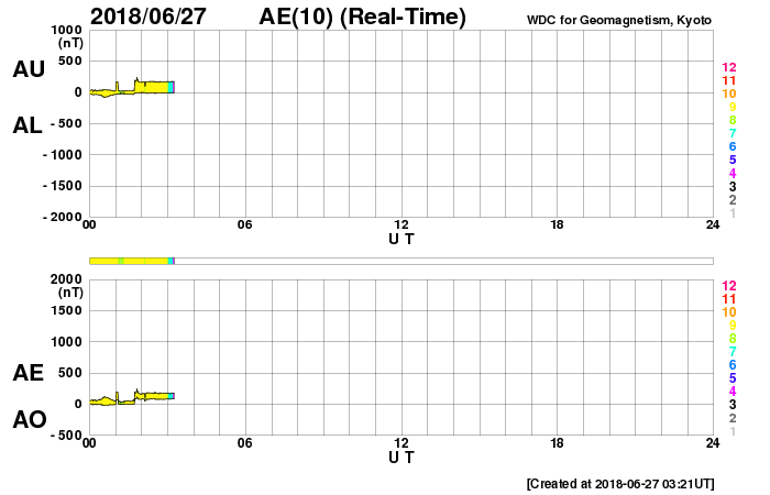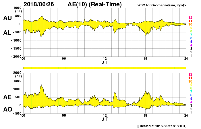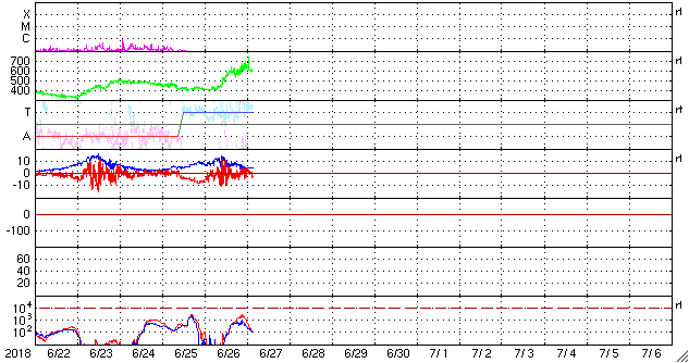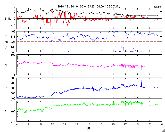 2018/ 6/27 12:31 更新 高速太陽風が到来し、速度は600km/秒に高まってます。 担当 篠原 太陽風の磁場強度は、昨日のニュースの後に10nTを超え、 15nT近くまで強まりました。 それと共に、速度の上昇も始まり、 26日19時(世界時26日10時)に500km/秒を超えて高速風になり、 27日0時(世界時26日10時)には600km/秒、 更に、今朝、27日8時(世界時26日23時)には、 650km/秒まで高まりました。 その後、速度は少し下がって、現在は600km/秒です。 コロナホールによる高速の太陽風が到来しています。 27日周期の図を見ると、 前周期よりも1日半近く変化が早くなっています。 6月24日にコロナホールの淡い広がりについて書きましたが、 その領域からの影響が来ている様です。 前周期の高速風は、700km/秒に達する変化も発生しました。 今回はどうなるでしょうか。 太陽風の強まりを受けて、 磁気圏の活動も高まった状態が続いています。 AE指数では、500〜800nTの中規模の変化が 連続的に発生しています。 一方、DSCOVR衛星の磁場のグラフでは、 南北成分は最後の辺りで北向きに振れています。 この傾向がこの後も続くと、 高速風は続いていますが、磁気圏は静かになっていくでしょう。 この後の南北成分の振れ方に注目してください。 27日前の高速風は、6月5日にかけて続いています。 今回はどこまで続くでしょうか。 太陽は、2715黒点群がかなり小さくなり、 このまま消えて、無黒点になりそうです。 X線グラフは、全体の強度も下がっています。
