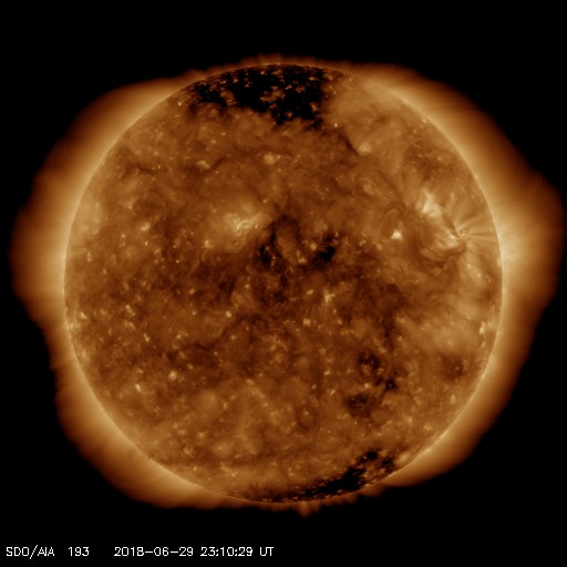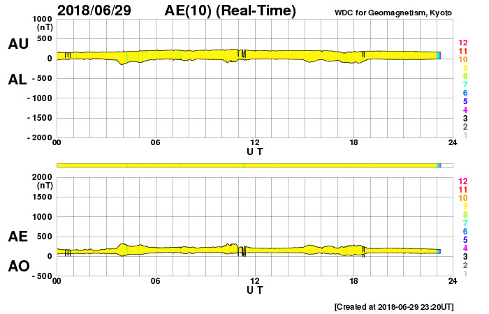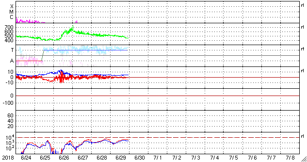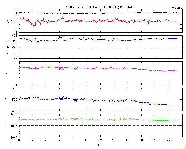 2018/ 6/30 08:25 更新 太陽風の速度は下がり始めています。 担当 篠原 太陽風の速度は、昨日の夕方に500km/秒を割り、 その後ゆっくりと低下して、 現在は450km/秒とやや高速の状態です。 磁場強度は、4nTで安定しています。 高速太陽風は終わりに近付いている様ですが、 27日周期の図を見ると、 前周期より1日半ほど早く始まったのと同じく、 1〜2日ほど早く終わるのかもしれません。 磁気圏は穏やかです。 オーロラの活動度を示すAE指数は、 特に変化なく推移しています。 今日のSDO衛星AIA193の太陽コロナ写真では、 太陽の東側(左側)にコロナホールは見えません。 前周期の太陽風の変化を見ると、 6月5日に高速風が終わった後、次第に低速の風になり、 13日後の6月18日に、次の速度の高まりが到来しています。 今回も同様とすると、 今後、2週間にわたって穏やかな太陽風が続く可能性があります。 太陽は、今日も無黒点です。 X線グラフも、低いレベルで安定しています。 STEREO Ahead衛星によると、 太陽の東端の向こう側にも活動的な領域は見られず、 太陽は、無黒点が続くかもしれません。