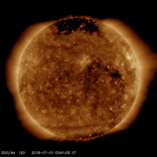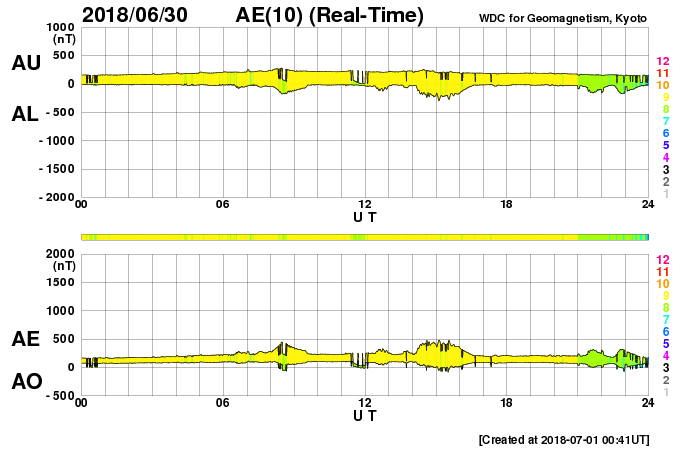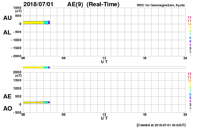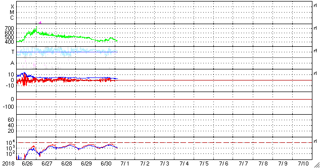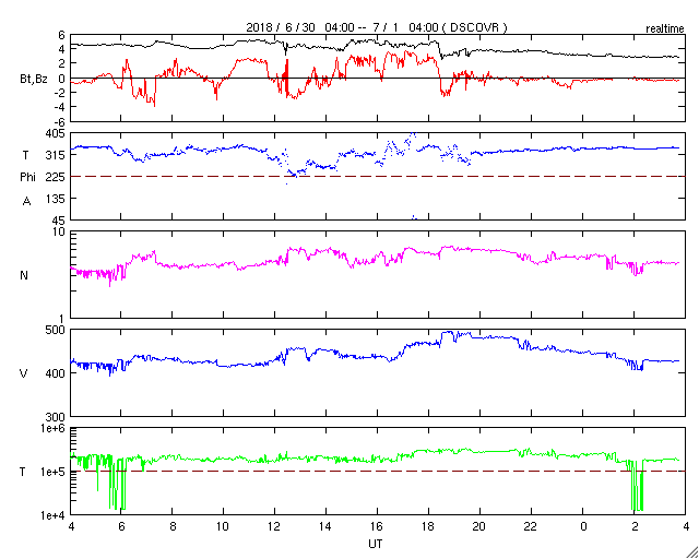 2018/ 7/ 1 13:00 更新 太陽風は平均的な速さに戻りつつあります。磁気圏も穏やかです 担当 篠原 太陽風は、420km/秒と平均的な速さまで下がったところで安定し、 今朝早く一時的に480km/秒まで上がる変化も起きましたが、 すぐに下がって、現在は再び420km/秒へ戻っています。 まだ、完全に落ち着いてはいませんが、 高速太陽風は終わろうとしています。 太陽風の磁場強度は、5nTから3nTヘ下がり、 やや弱くなっています。 南北成分は、グラフの前半は小さく南北に変化していますが、 後半は0nT付近に留まっています。 磁気圏は概ね静穏で、 AE指数は、小さい高まりが数回起きている程度です。 SDO衛星AIA193では、 太陽の中央部から東側(左型)にかけては、 全体がぼんやりと見えていて、コロナホールは見られません。 現在の太陽風が落ち着いた後は、 穏やかな状態がしばらく続きそうです。 太陽は、黒点は見られず、 X線グラフも変化のない状態です。
